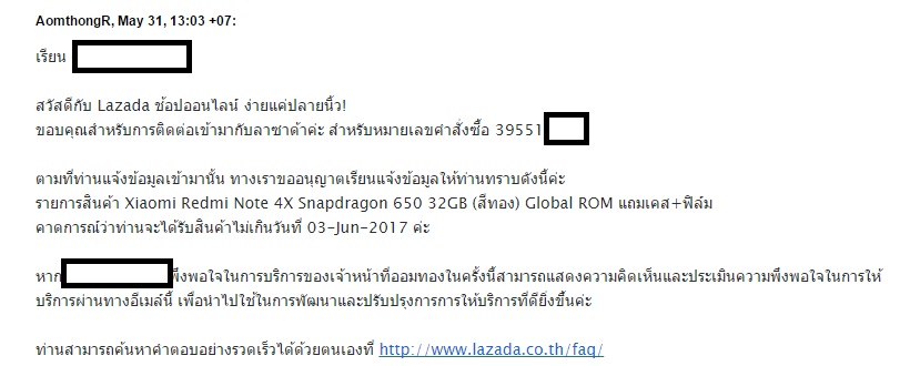 ได้มีการสอบถามไปยัง Lazada ทาง Lazada ตอบว่า สินค้ามาทันในกำหนด (คือ 3/6/2017) แน่นอน (ตามภาพล่างนี้)