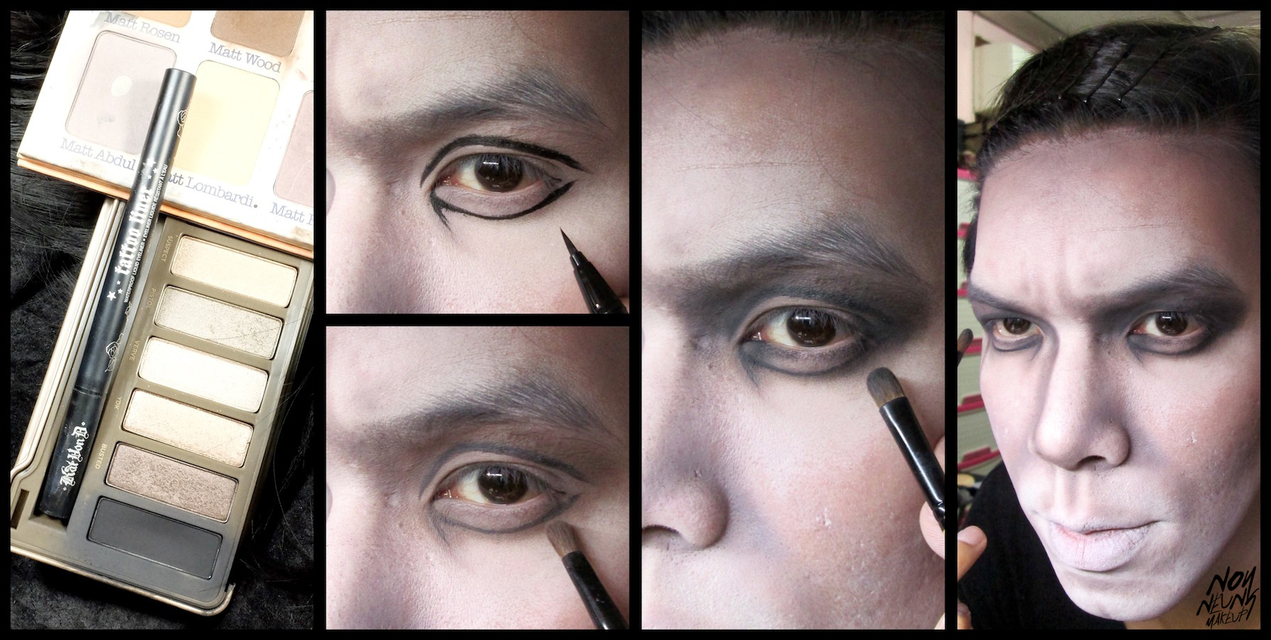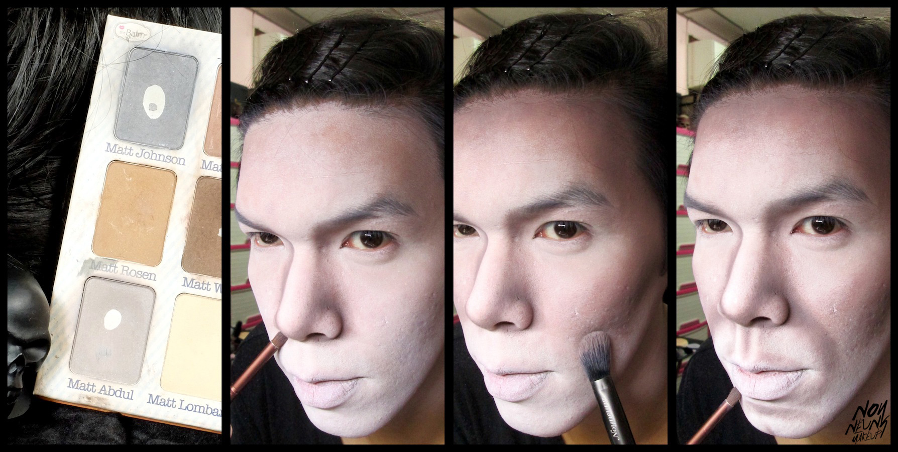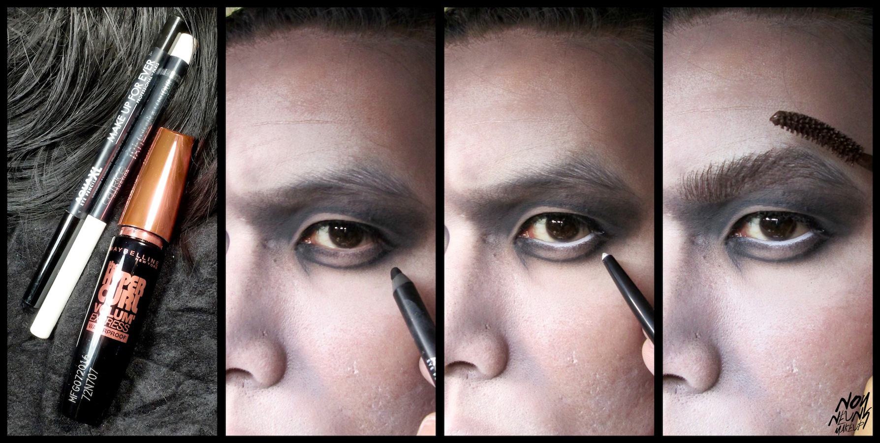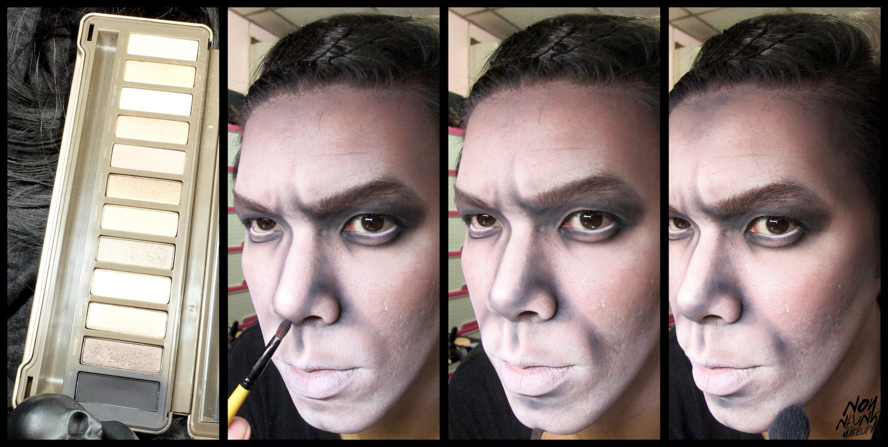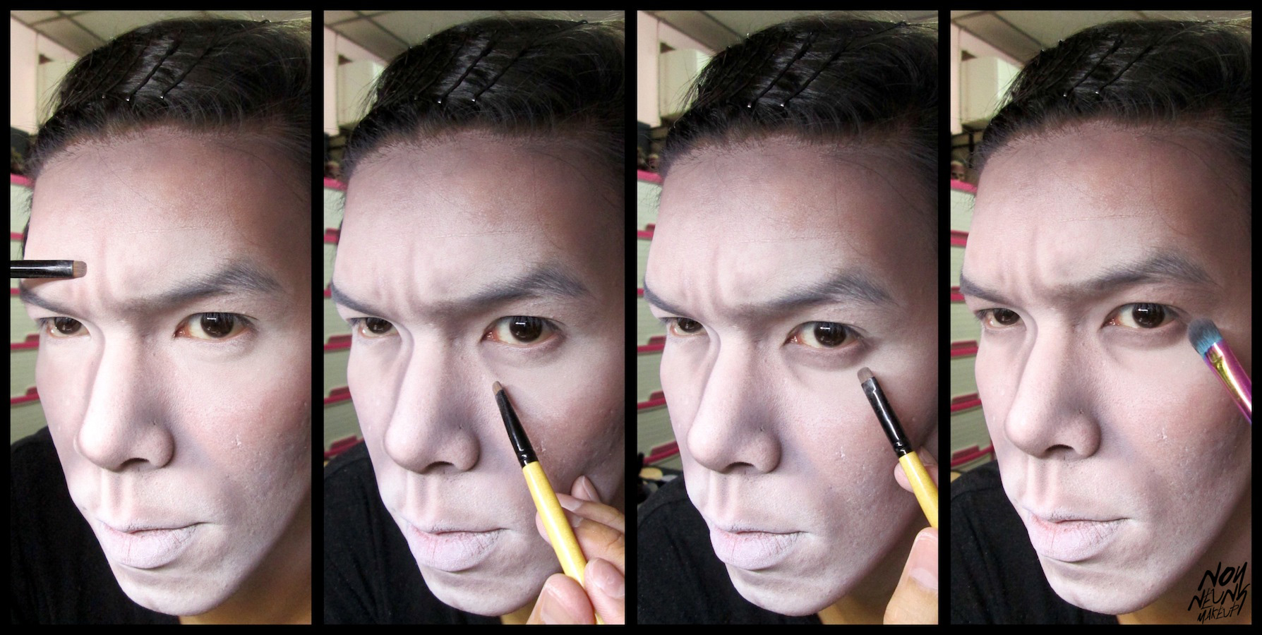 เสร็จแล้วเราก็มาเน้นมิติรอบๆเส้นด้วยชาโดว์เทาและดำ จริงๆแล้วเมคอัพในหนังเค้าจะมีชิ้นต่างๆมาแปะให้ดูนูนขึ้น แต่คอนเซปเราเป็นการเพนท์ เราก็เพนท์หลอกว่า เหยแก มันไม่ได้แบนหนาเหวยยยย ฟิวนั้น 555 ถมกรอบหน้าและหูด้วยครีมสีดำ เซตด้วยชาโดว์ดำให้เรียบร้อย