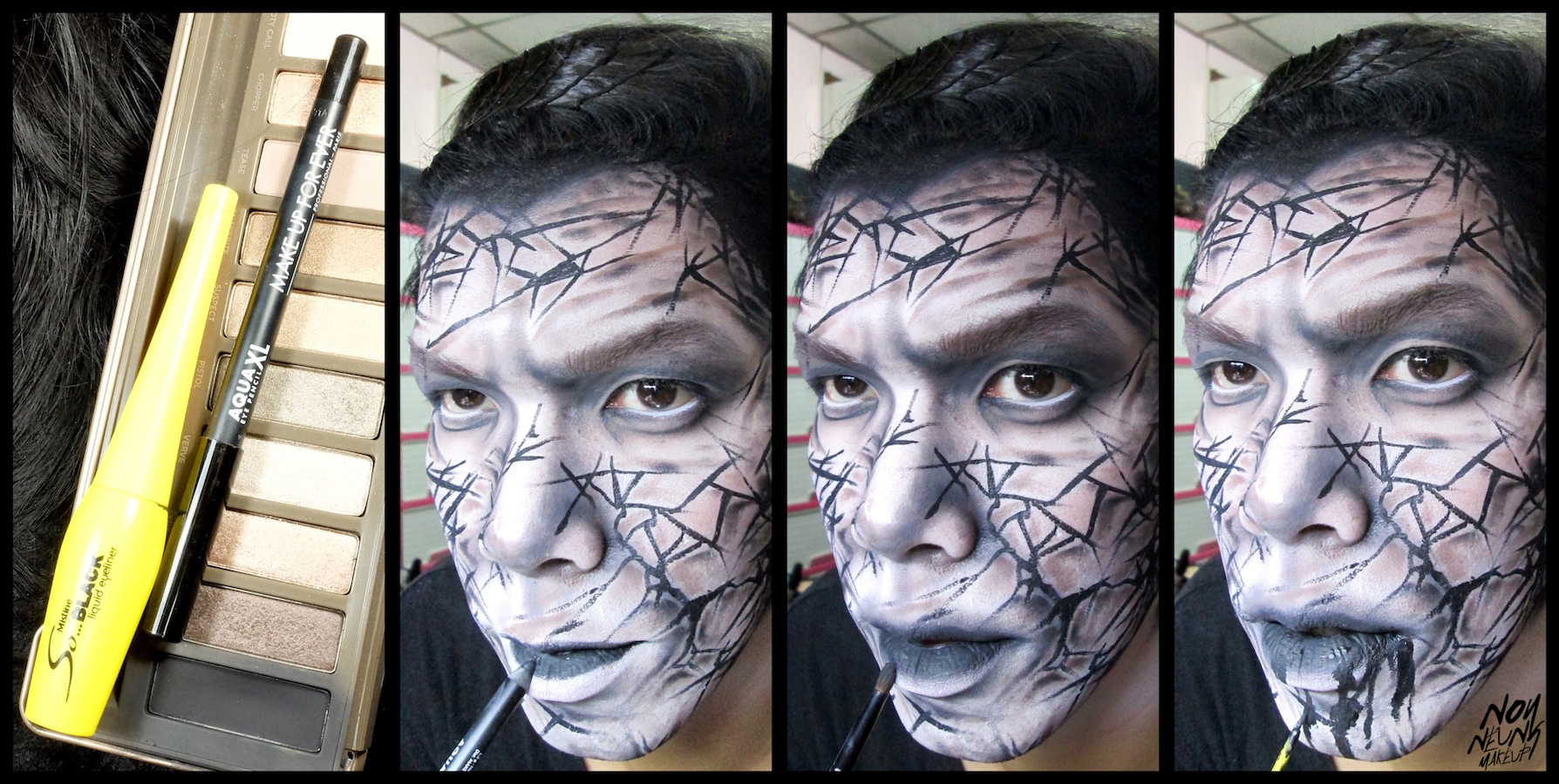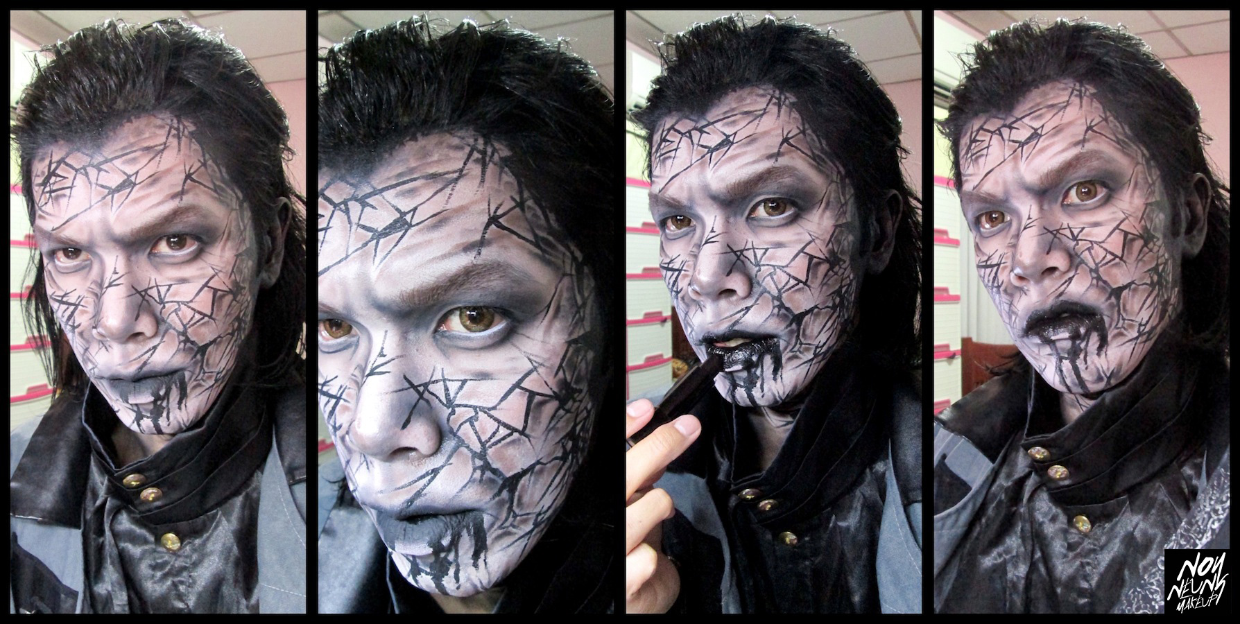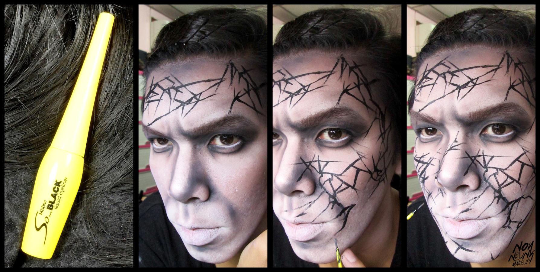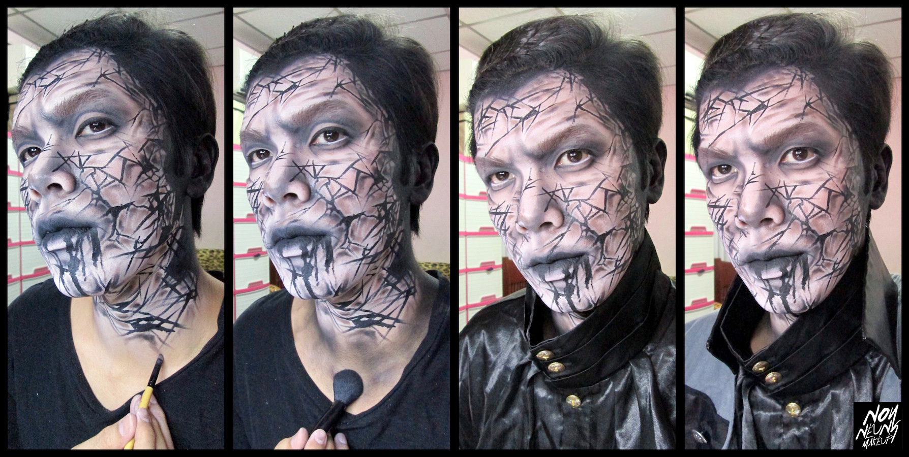เมคอัพตัวนี้เด่นๆเลยก็คือการเขียนรอยแตกนั่นแหละ ต้องระวังเรื่องคาแรคเตอร์ของเส้นมากๆ เพราะถ้าเขียนผิดไป จะสามารถดูเป็นอย่างอื่นได้เลยเช่น เส้นเลือด ฟ้าผ่า ต้นไม้ อะไรทำนองนี้ ต้องบังคับแต่ละเส้นให้ค่อนข้างตรงและหัวท้ายแหลม ง่ายที่สุดคือดูแบบแล้วค่อยๆทำตาม ส่วนสีดำที่ใช้ ให้เป็นเนื้อแมทที่สุด อย่าเงามาก จะดูไม่เน้นความลึกเท่าแบบแมท และที่ใช้จิ้มจุ่มเพราะส่วนตัวคิดว่า เนื้อไลเนอร์จะออกมาเยอะกว่า ชุ่มกว่า ถ้าใช้เนื้อบางๆเนี่ยบางทีเราลากไปบนผิว ด้วยแรงมือเรา มันจะไปผสมกับสีรองพื้นก่อนหน้าได้ แล้วดำจะดูไม่ดำ ลองดูนะ เหมือนยากแต่ไม่ยากหรอกเด้อ.