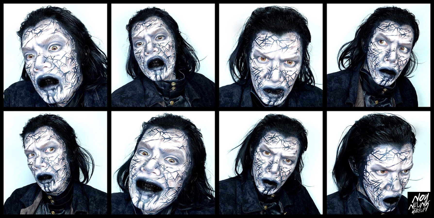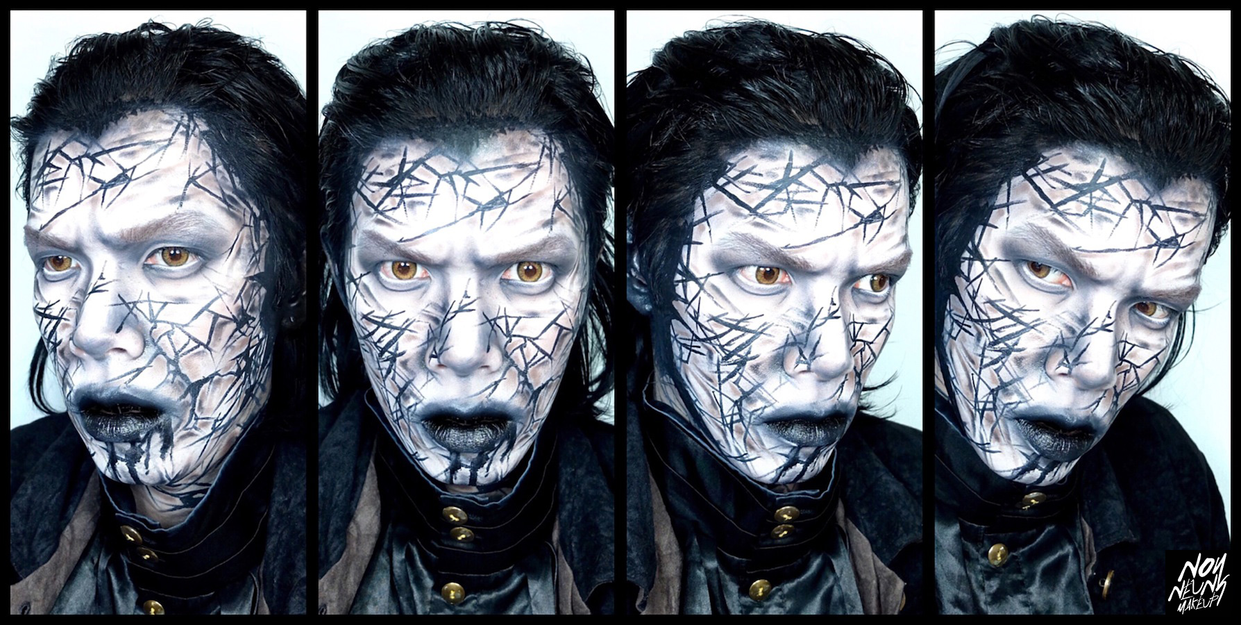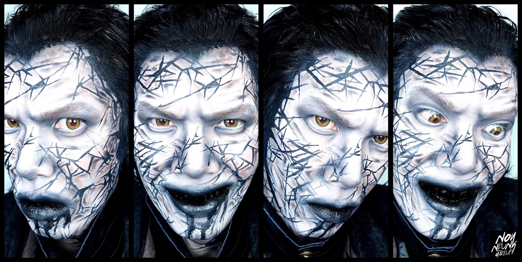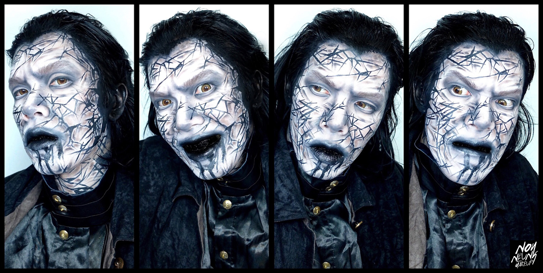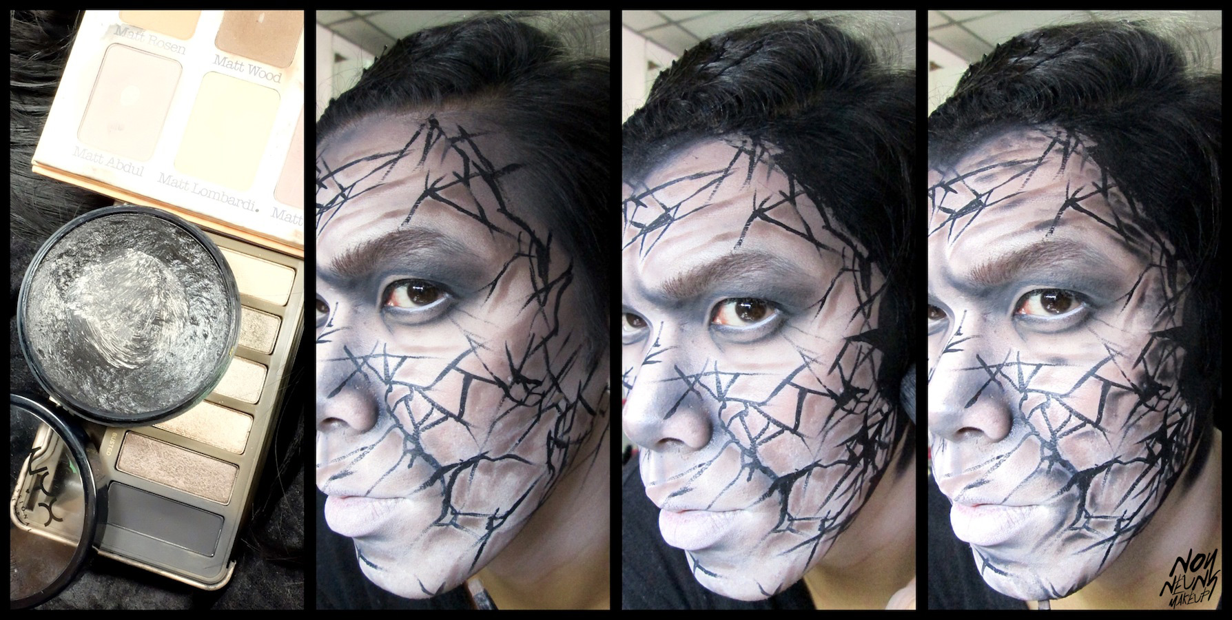 เมคอัพตัวนี้เด่นๆเลยก็คือการเขียนรอยแตกนั่นแหละ ต้องระวังเรื่องคาแรคเตอร์ของเส้นมากๆ เพราะถ้าเขียนผิดไป จะสามารถดูเป็นอย่างอื่นได้เลยเช่น เส้นเลือด ฟ้าผ่า ต้นไม้ อะไรทำนองนี้ ต้องบังคับแต่ละเส้นให้ค่อนข้างตรงและหัวท้ายแหลม ง่ายที่สุดคือดูแบบแล้วค่อยๆทำตาม ส่วนสีดำที่ใช้ ให้เป็นเนื้อแมทที่สุด อย่าเงามาก จะดูไม่เน้นความลึกเท่าแบบแมท และที่ใช้จิ้มจุ่มเพราะส่วนตัวคิดว่า เนื้อไลเนอร์จะออกมาเยอะกว่า ชุ่มกว่า ถ้าใช้เนื้อบางๆเนี่ยบางทีเราลากไปบนผิว ด้วยแรงมือเรา มันจะไปผสมกับสีรองพื้นก่อนหน้าได้ แล้วดำจะดูไม่ดำ ลองดูนะ เหมือนยากแต่ไม่ยากหรอกเด้อ.