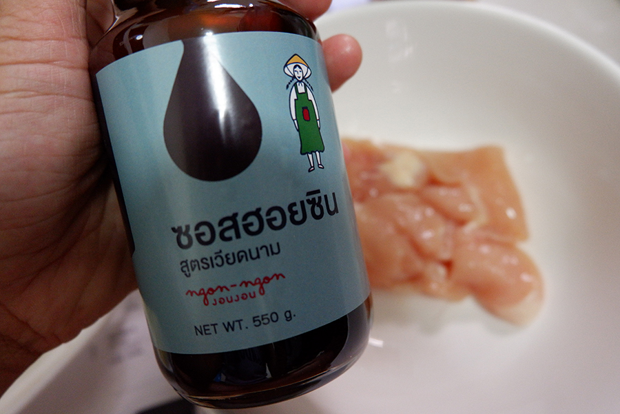 เราจะใช้ซอยฮอยซินขวดสีดำ 'งอนงอน' นี่เป็นส่วนผสมในการหมักไก่ของเรา จากนั้นก็ตีไข่ตอกลงไปพร้อมกับใส่วุ้นเส้นลงไปด้วย