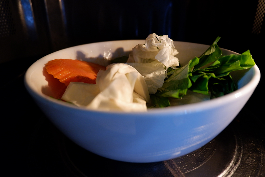 เปิดออกเติมน้ำซุปหรือน้ำเปล่าลงไป ไม่ต้องเยอะมาก พร้อมกับยัดน้องตระกูลผักไปเลยจ้า กดเวฟสัก 2-3 นาที