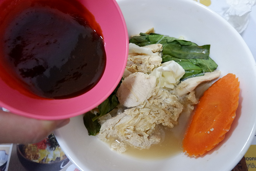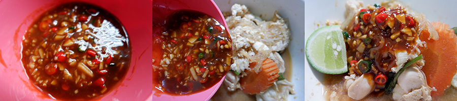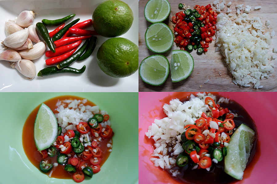 คือต้องเติมกระเทียมสับละเอียด พริกขี้หนูสดซอย และบีบมะนาวลงไปด้วย จะได้รสเปรี้ยวเค็มเผ็ด