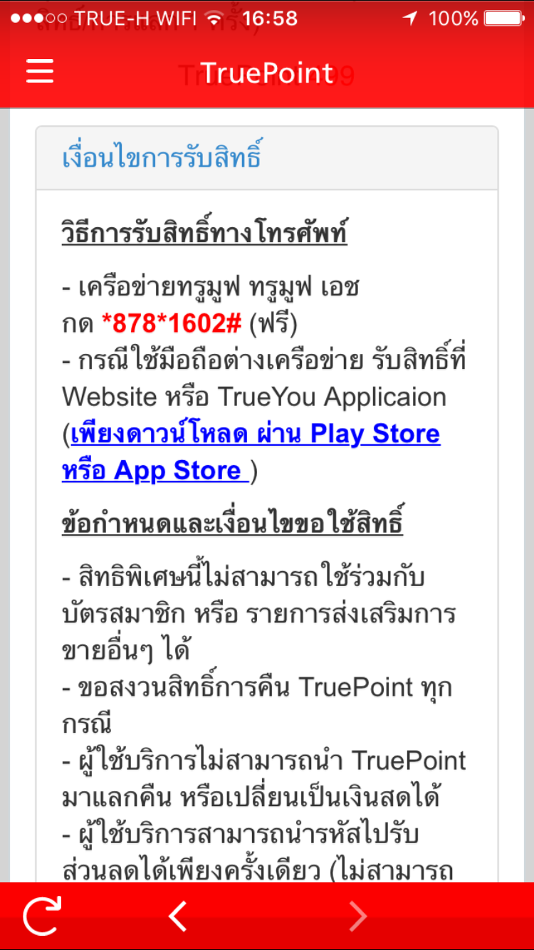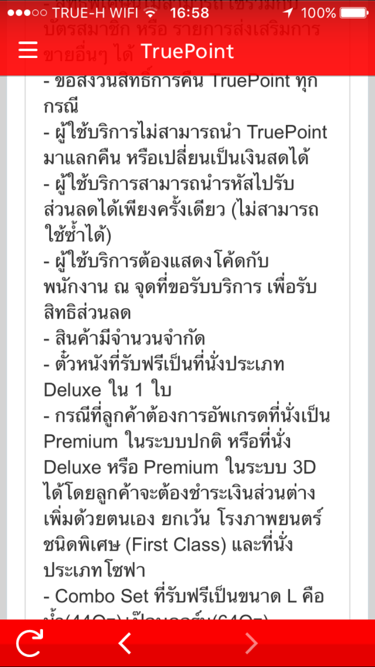 แต่ก่อนกดได้ตลอดครับและเข้าใจว่าถ้าเราใช้ True Points แลกมันจะไม่เกี่ยวกับมีกี่สิทธิ์ต่อเดือน ที่นี้เมื่อไม่นานมานี้ผมลองกดใช้ True Points แต่กดปุ้บขึ้นสิทธิ์เต็ม!!!! ซึ่งแต่ก่อนกดได้ตลอดไม่เคยมีเต็มแถมใช้ได้ถึงเดือนหน้าไม่ต้องใช้แบบวันต่อวันเหมือนสิทธิ์ลด 50% โอ้วแม่เจ้า รู้สึกว่าทำไมเหมือนโดนลดสิทธิ์ลงเรื่อยๆอ่ะ อุตสาห์หนีมาจากสิทธิ์ 50% แล้วน่ะ ด้วยความสงสัยเลยกดเข้าไปดูเงื่อนไข้การใช้ 499 คะแนนแลกรับตั๋วหนัง 1 ใบ + เครื่องดื่ม + popcorn ของ SF มีข้อหนึ่งบอกว่า "สินค้ามีจำนวนจำกัด" (ตามรูป) คำถามคือ: