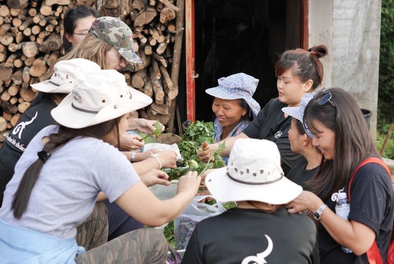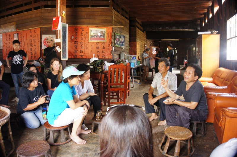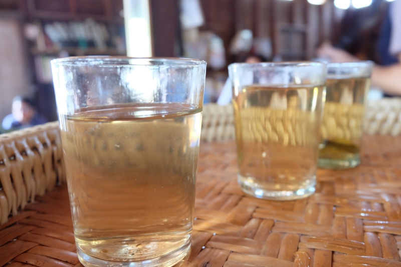 เวลา 13.00 น. แวะจิบน้ำชาและกล่าวทักทายคุณเจริญศักดิ์ เลิศวรายุทธ์ อดีตผู้ใหญ่บ้านคนแรกของหมู่บ้านสันเจริญและเป็นผู้ปลูกกาแฟต้นแรกของดอยสันเจริญ พร้อมด้วยครอบครัวที่ออกมาต้อนรับพวกเราเป็นอย่างดี กิจกรรมนี้จึงเป็นธรรมเนียมที่พวกเราปฏิบัติก่อนจะขึ้นดอยทุกครั้ง ซึ่งชาที่คุณเจริญศักดิ์ เลิศวรายุทธ์ได้นำมาชงให้พวกเราดื่มนั้น ท่านเป็นผู้ที่ปลูกด้วยตนเองบนดอยสวนยาหลวงที่ระดับความสูง 1,400 เมตร ท่านเรียกชานี้ว่า “ชาองค์นิน” ซึ่งเป็นชื่อของท่านนั่นเอง เป็นพันธุ์ชาแดงที่มียอดสีแดงสด มีต้นกำเนิดมาจากประเทศจีน มีกลิ่นและรสชาติดีซึ่งแตกต่างจากชาแดงทั่วๆไป คุณเจริญศักดิ์เล่าถึงตำนานชาที่ท่านปลูกเอาไว้ว่า บรรพบุรุษชนเผ่าเมี่ยนของท่านได้นำชาพันธุ์นี้ติดตัวมาด้วย เมื่อสมัยอพยพในครั้งนั้น เรียกได้ว่าชาองค์นินที่คุณเจริญศักดิ์ปลูกอยู่นั้น ได้ผ่านการคัดเลือกพันธุ์ที่ดีที่สุดมานับตั้งแต่บรรพบุรุษเลยทีเดียว ซึ่งการดื่มชานั้นถือว่าเป็นเรื่องปกติธรรมดาของที่นี่ และอาจจะเรียกได้ว่าเป็นวิถีชีวิตเลยก็ว่าได้ ในสมัยเมื่อก่อนนั้นการดื่มชาจะช่วยให้ความอบอุ่นแก่ร่างกายเพราะถิ่นกำเนิดของชนเผ่าเมี่ยนนั้นอยู่ในพื้นที่สูงและมีอากาศหนาว จึงเห็นได้ว่าเสื้อผ้าและเครื่องแต่งกายของชาวเมี่ยนจะมีความนุ่มหนา มีขนสีแดงที่คอเพื่อป้องกันความหนาวเย็นนั่นเอง การแวะพักดื่มชาและกล่าวทักทายครอบครัวคุณเจริญศักดิ์นั้น เป็นการต้อนรับที่แสนอบอุ่นและประทับใจ