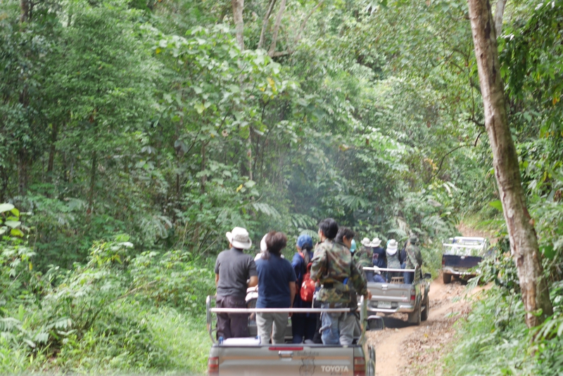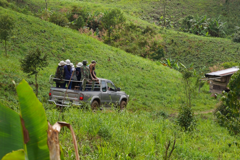 เวลา 14.00 น. ขนสัมภาระและกล้าไม้ขึ้นรถที่ คุณพรเทพ เลิศวรายุทธ์ จัดเตรียมไว้สำหรับการเดินทางขึ้นสู่ดอยสวนยาหลวง ไร่กาแฟที่เป็นจุดหมายปลายทางที่เราจะไปกัน ใช้เวลาเดินทางประมาณ 1 ชั่วโมง ด้วยระยะทาง 14 กิโลเมตร จากหมู่บ้านสันเจริญ ลัดเลาะตามไหล่เขาขึ้นไปจากระดับความสูง 500 เมตร ไปจนถึง 1,500 เมตร จากระดับน้ำทะเล ต้องใช้ยานพาหนะด้วยรถยนต์ขับเคลื่อน 4 ล้อ (4WD) เนื่องจากสภาพถนนที่พวกเราเดินทางกันในวันนั้นเป็นดินโคลน และมีน้ำกัดเซาะ เนื่องจากก่อนหน้านี้ 1 วันมีฝนตกทำให้การเดินทางต้องใช้ความระมัดระวังและมีผู้ที่มีประสบการณ์ขับรถให้ตลอดเส้นทาง การเดินทางในครั้งนี้แม้จะยากลำบาก แต่พวกเราก็ลืมสิ่งเหล่านี้ไปเลย ถึงแม้ว่ารถจะโยกเยกไปตามถนนแต่กลับได้ยินแต่เสียงหัวเราะและเสียงร้องเพลงของทีมงานตลอดเส้นทาง บรรยากาศในวันนี้ไม่ร้อนแม้แต่นิดเดียว ยิ่งตอนที่ขับผ่านเข้าไปในช่วงที่เป็นป่าต้นไม้ใหญ่ ยิ่งทำให้รู้สึกว่านี่ใช่ฤดูร้อนหรือฤดูหนาวกันแน่ เพราะอากาศเย็นมาก มองไปข้างทางทั้งสองข้างมีแต่ต้นไม้ใหญ่ที่โตเต็มที่เรียงรายเต็มไปหมด แต่ละต้นนั้นน่าจะมีอายุไม่ต่ำกว่าร้อยปีเลยทีเดียว และที่สำคัญนั่นคือ มีไลเคนให้เห็นเป็นจำนวนมาก แสดงให้เห็นถึงความชุ่มชื้นและความอุดมสมบูรณ์ของผืนป่าแห่งนี้ ระหว่างทางได้ยินเสียงนกร้อง ได้เห็นสัตว์เล็กสัตว์ใหญ่วิ่งลงมากินน้ำที่ไหลเอื่อยๆออกจากรูหน้าผาข้างทาง ภาพความประทับใจเหล่านี้ ทำให้พวกเราลืมความเหน็ดเหนื่อยกันไปเลยทีเดียว