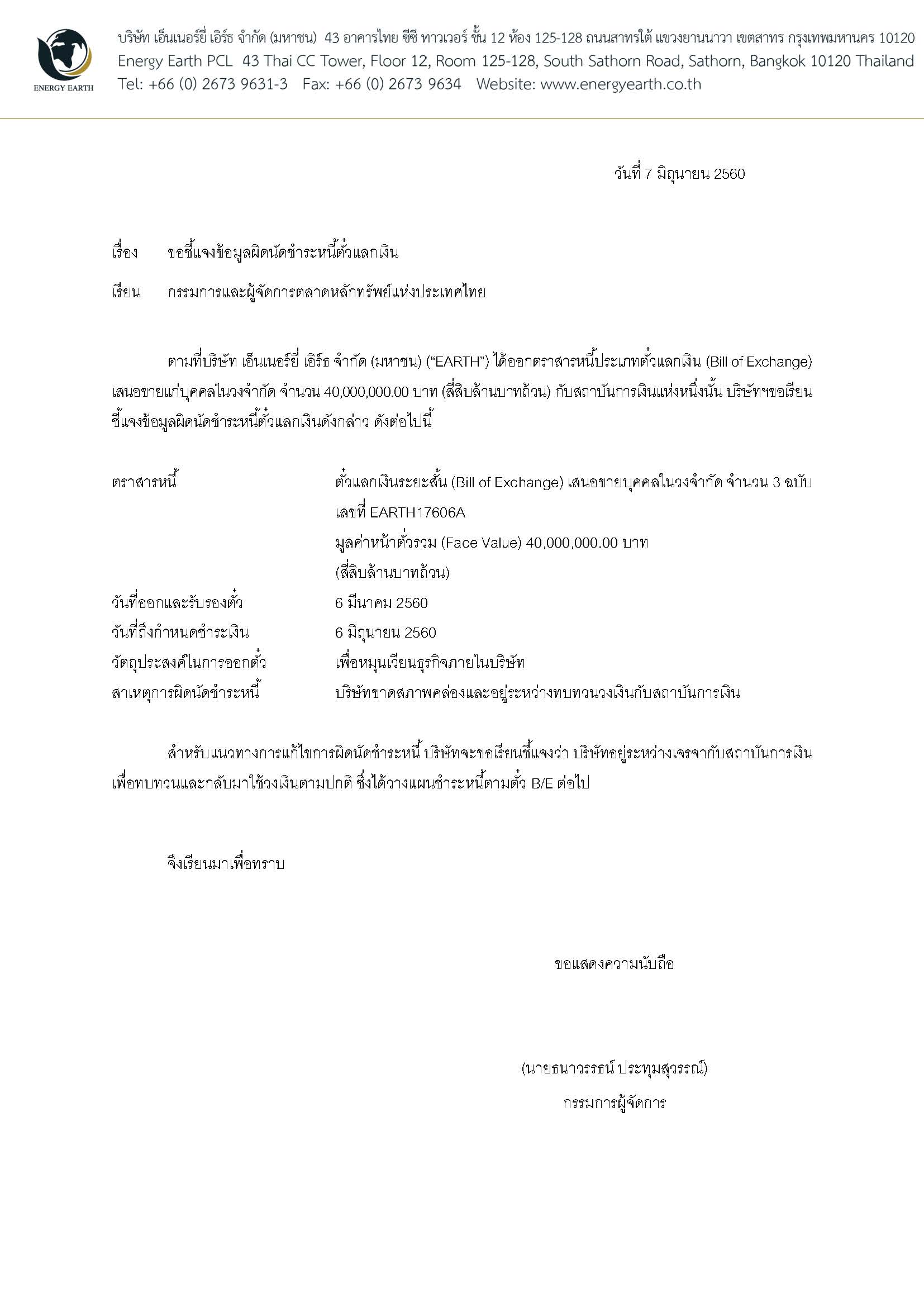 ข่าว EARTH ผิดนัดชำระตั๋ว B/E