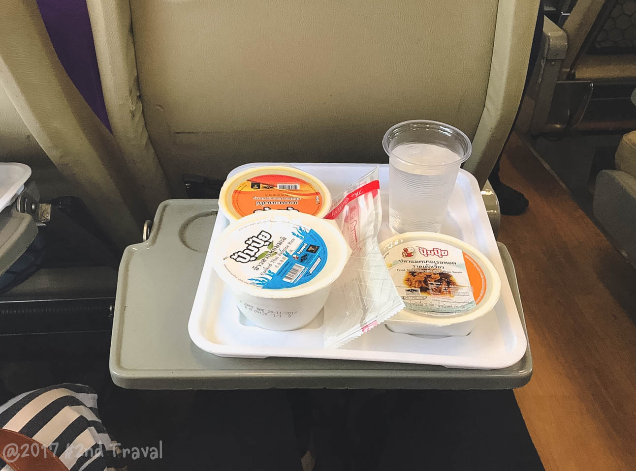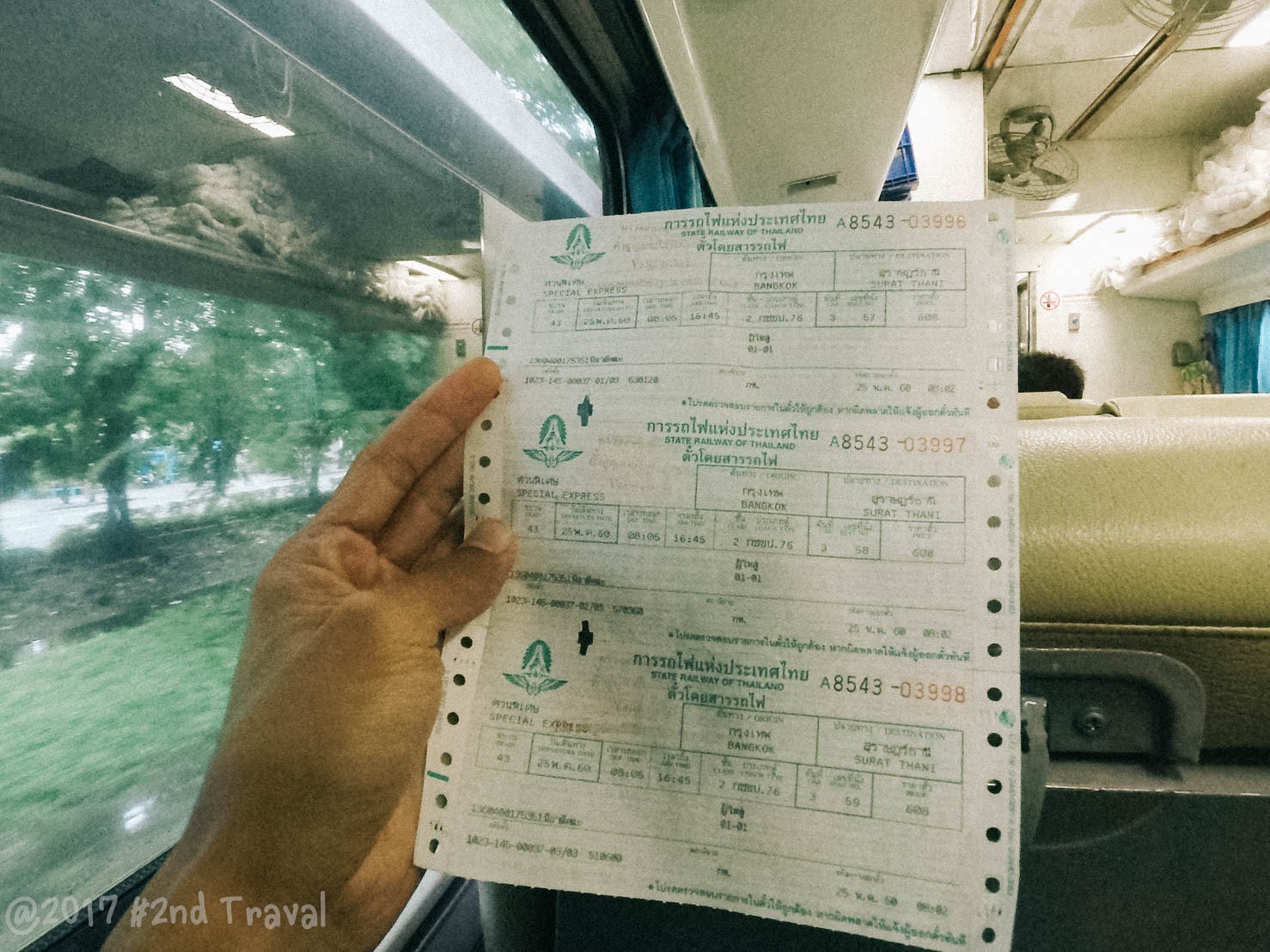 พร้อมออกเดินทางด้วยตั๋วรถไฟ 3 ใบ ราคาใบละ 608 บาท เป็นตู้โดยสารแอร์เย็นสบายดี สะอาดพอได้ค่ะ สิ้นสุดปลายทางที่สุราษฎร์ธานี เวลาที่จะถึงประมาณ 17.00 น. ( 9 ชั่วโมงโดยประมาณ ) แล้วรถไฟก็ค่อยๆเคลื่อนออกจากหัวลำโพงช้าๆ เส้นทางผ่านบ้าน ชุนชน แม่น้ำ คลอง ภูเขา ท้องนา ฟาร์มกุ้ง เลียบเขา ชายทะเล สวนปาล์ม สวนยางพารา เป็นต้น บรรยากาศสวยงามมาก หลับบ้าง ถ่ายรูปบ้าง กินข้าว เข้าห้องน้ำ ทุกอย่างเสร็จสรรพบนรถไฟ และแล้วเราก็มาถึงสุราษฎร์ธานี มันได้บรรยากาศดีเหมือนกันนะคะ สำหรับการนั่งรถไฟมาใต้ครั้งแรกของพวกเรา ตื่นเต้น ลุ้นระทึก ได้ชมบรรยากาศแบบเต็มที่สองข้างทางที่รถไฟขบวนของเราผ่านตลอด 9 ชั่วโมงกว่าๆ อันนี้ขอกระซิบว่า ประหยัดตังค์ด้วยนะคะ