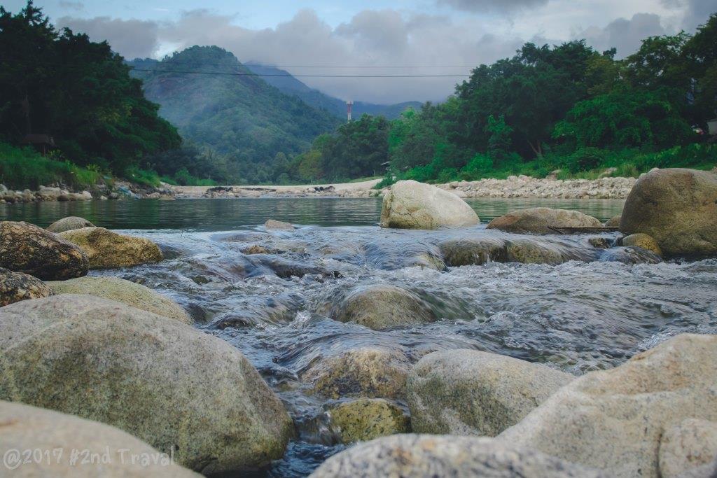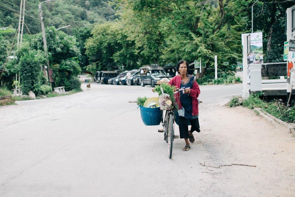 ได้เห็นคุณยายใส่เสื้อคอกระเช้าเดินข้ามสะพานไปทำธุระ ไปซื้อของ หรือคนที่นี้จะกร่อนคำให้สั้นลงเป็นคำว่า “ไป หลาด” ผู้ชายขับรถวิบากมีตะกร้าให้ท้ายรถเพื่อเข้าไปที่สวนบนเขาเก็บของ เก็บผลไม้ และนี่แหละพวกเราจะปั่นจักรยานสำรวจเลียนแบบบ้าง ด้วยความที่ยังเช้าอยู่จึงพากันลงไปเล่นในคลอง มีน้ำไหลเอื่อยๆ น้ำใสมาก เย็นสดชื่น ปลาพวงแหวกว่ายเต็มไปหมด และพวกเราก็ได้ภาพมาเป็นที่พอใจจึงเดินกลับที่พัก เพื่อกินข้าวเช้ากัน