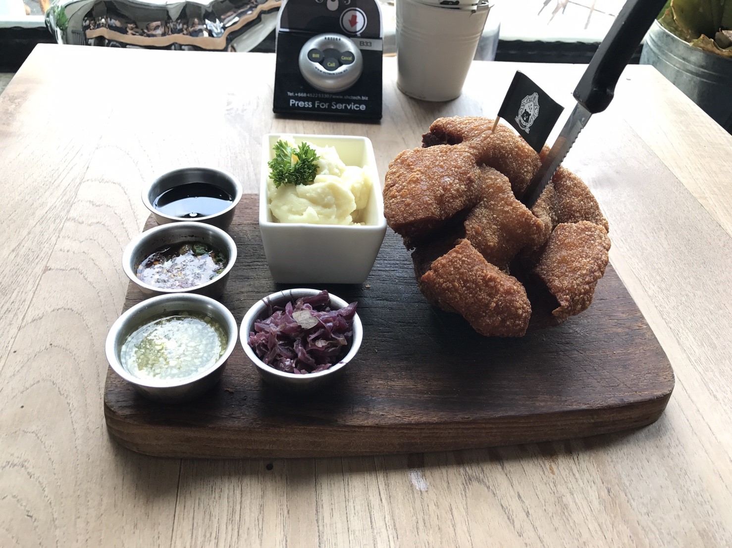 เมนูแรกที่เราได้ชิมคือ “ขาหมูทอด” ขาใหญ่มาก หนังกรอบ เนื้อนุ่ม มาคู่กับมันบดเนื้อละเอียด เพิ่มรสด้วยเครื่องเคียงกระหล่ำม่วงดองลงตัวสุดๆ แถมมีน้ำจิ้มให้เลือก คือ น้ำจิ้มซีฟู้ด ซีอิ้วหวาน และน้ำจิ้มแจ่ว เมนูนี้ขอบอกว่าขนาดเราไม่ชอบมันๆ ยังเกลี้ยงงง