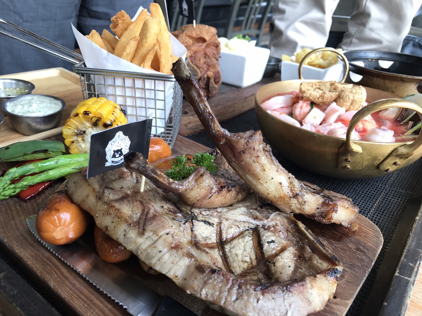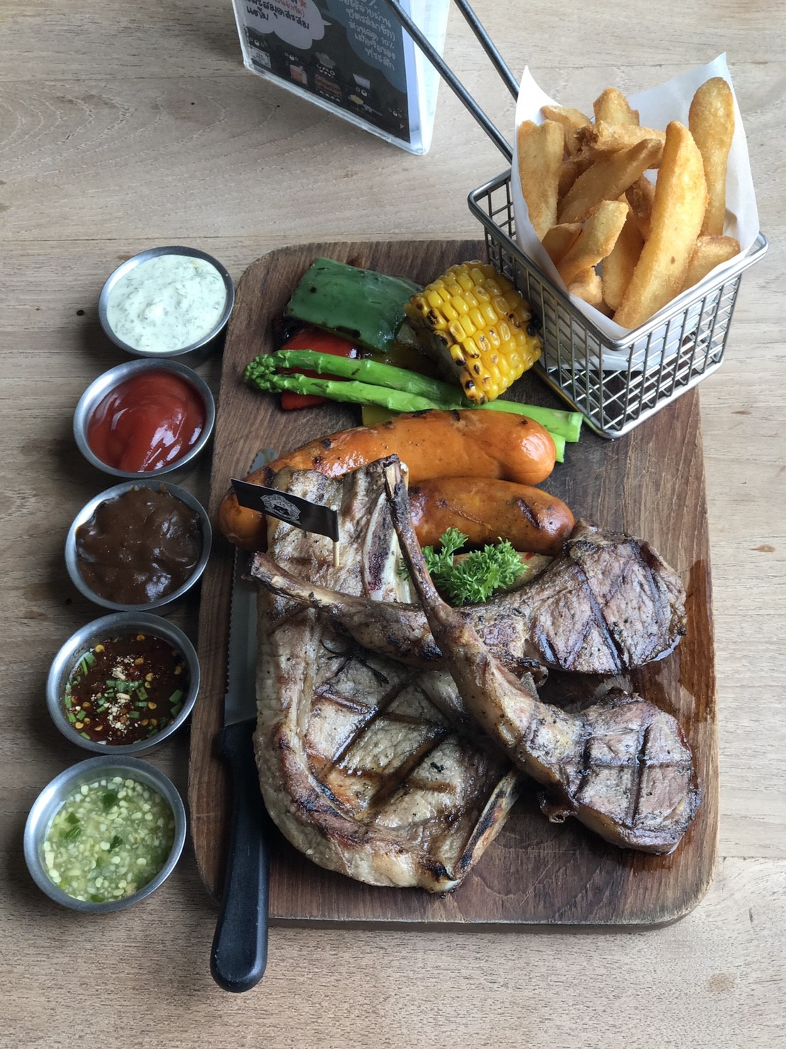 ชิมกันต่อกับ “De Bear Combo Mix Grill” เนื้อเน้นๆ กับหมูซี่โครงชิ้นโตย่างสุกกำลังดี ซี่โครงแกะที่หมักเครื่องเทศเข้าถึงเนื้อ และไส้กรอกรมควันหอมๆ อีก 3 ชนิด เสิร์ฟพร้อมกับเฟร้นฟรายทอดกรอบนอกนุ่มใน จานนี้มีน้ำจิ้มให้เลือกฟินมากถึง 5 แบบ คือ น้ำจิ้มซีฟู้ด ซอสมะเขือเทศ จิ้มแจ่ว พริกไทยดำ และซัลซ่าซอส