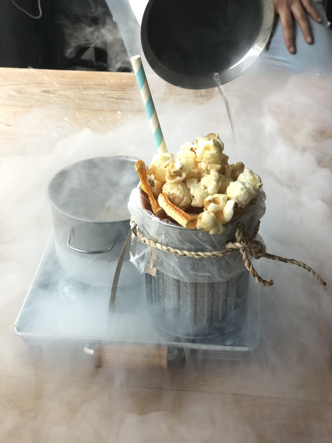 ลสุดแนวมาในแก้วถังขยะใบเล็ก สดชื่นด้วยความเปรี้ยวและกลิ่นหอมๆ ของผลไม้ โรยหน้าด้วยป๊อบคอร์น เสิร์ฟพร้อมความตื่นตาตื่นใจด้วย Dry Ice ไฮโดรเจน ให้ความรู้สึกเย็นสุดขั้วจริงๆ ค่ะ แม้ว่าเครื่องดื่มแก้วนี้จะเป็นค็อกเทล แต่เราไม่รู้สึกถึงแอลกอฮอลเลยค่ะ เจ๋งอ่ะ