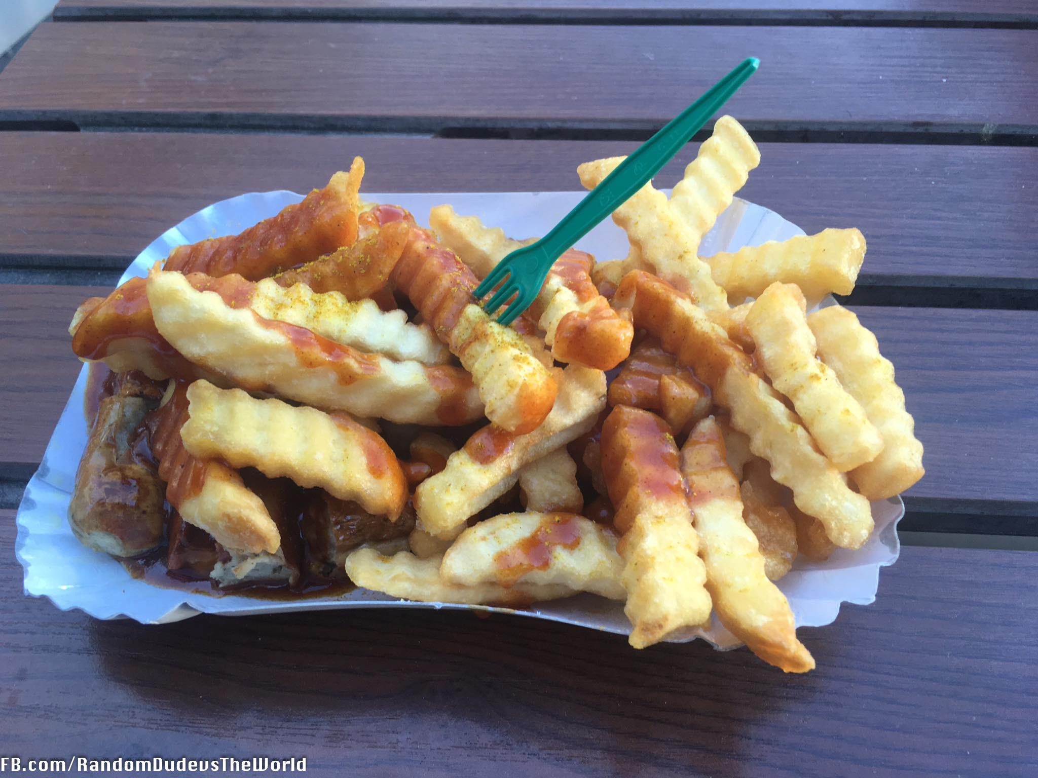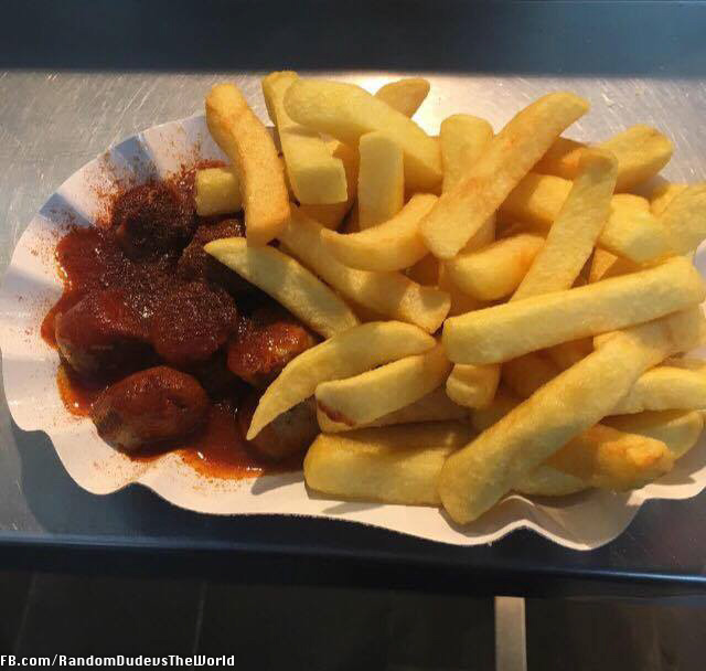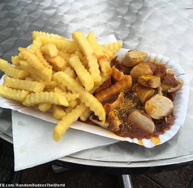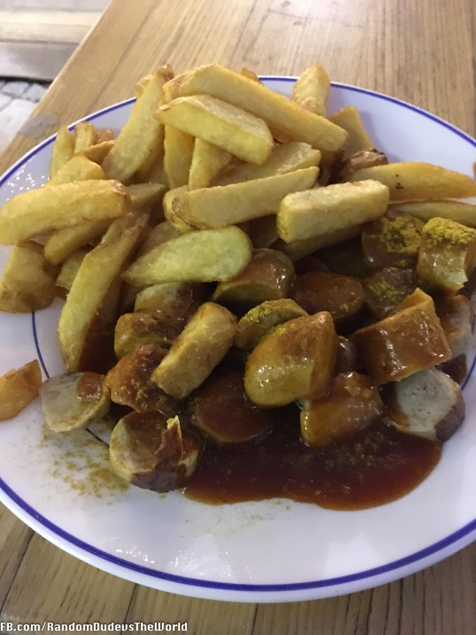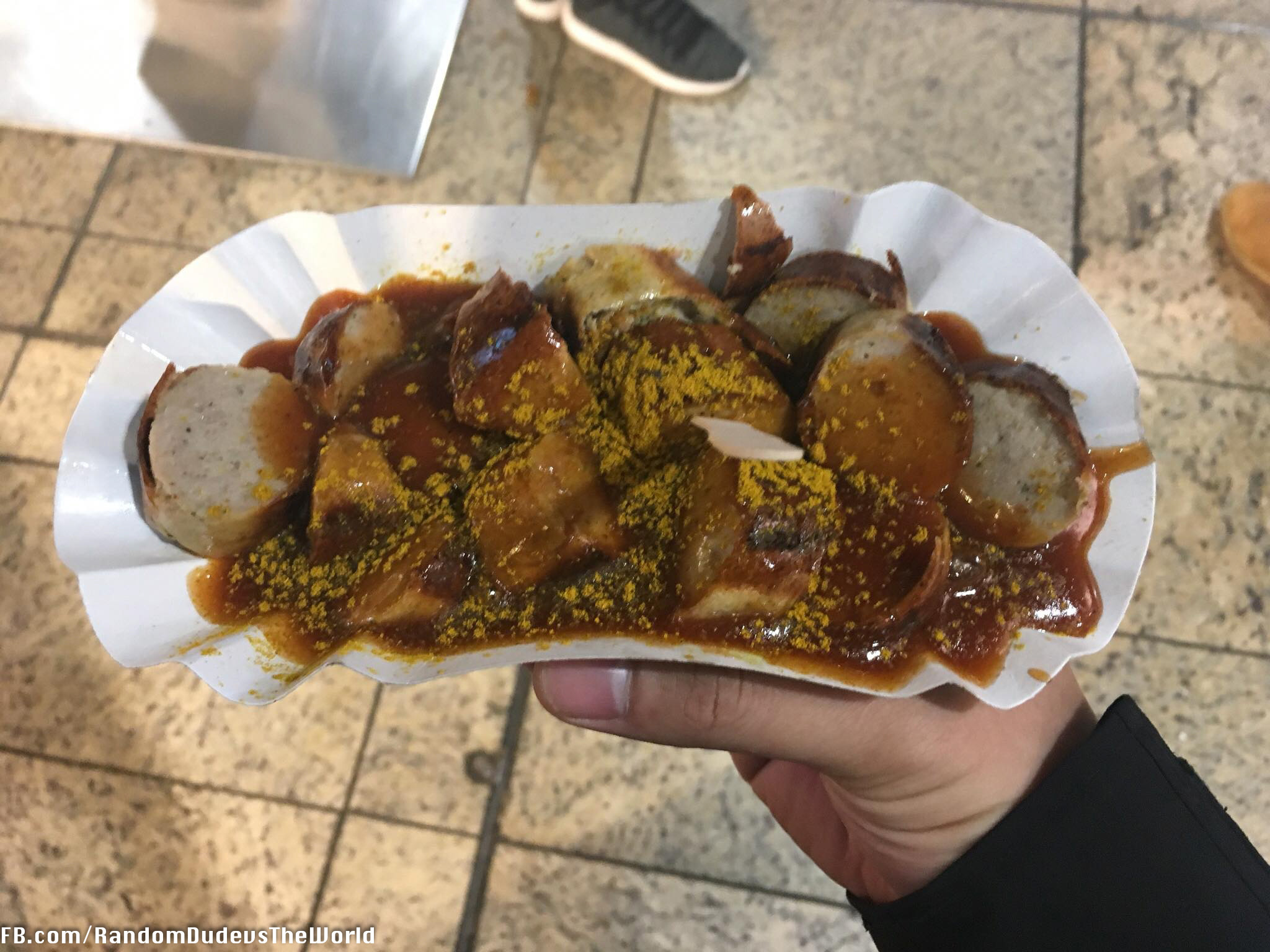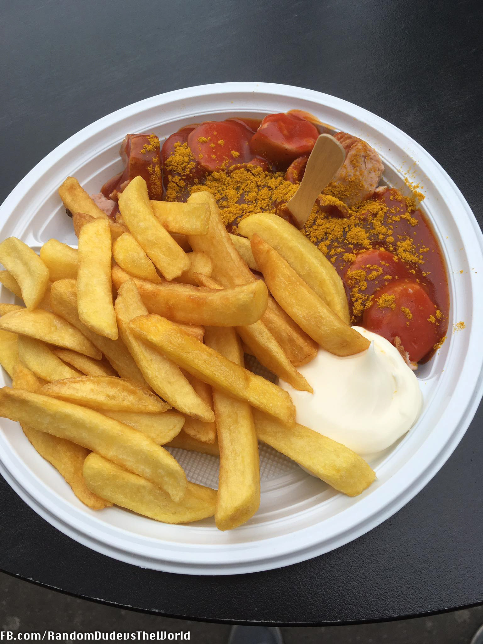 สำหรับคนที่ไม่คุ้นเคยนะครับ Currywurst คืออาหาร fast food ที่เป็นที่นิยมของชาวเยอรมัน โดยจะนำใส้กรอกทอดมาราดซอสแกงกระหรี่ กินคู่กับมันฝรั่งทอด (Pommes) หรือขนมปัง (Brötchen)