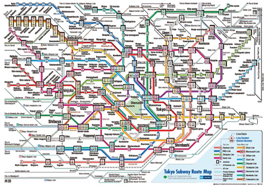 หลังจากอ่านหนังสือจบ ก็มีสถานที่ท่องเที่ยวที่จะไปไว้ในใจคร่าว ๆ แระค่ะ จากนั้นจึงเริ่มศึกษาการเดินทางว่าแต่ละสถานที่ที่เราจะไปนั้น เดินทางยังไงจึงจะสะดวกสุดสำหรับคนไม่เก่งภาษาอย่างเราสองคน มะม้วนเลยเลือกการเดินทางด้วยรถไฟค่ะ เนื่องจากดูแผนที่รถไฟฟ้าของญี่ปุ่นในหนังสือที่ซื้อมานั้น คิดว่าเส้นทางมันครอบคลุมทุกสถานที่ท่องเที่ยวที่เราอยากไป หน้าตาแผนที่ประมาณนี้นะคะ ถ้าจะดูชัด ๆ เสริช์หา google ได้เลยค่ะ