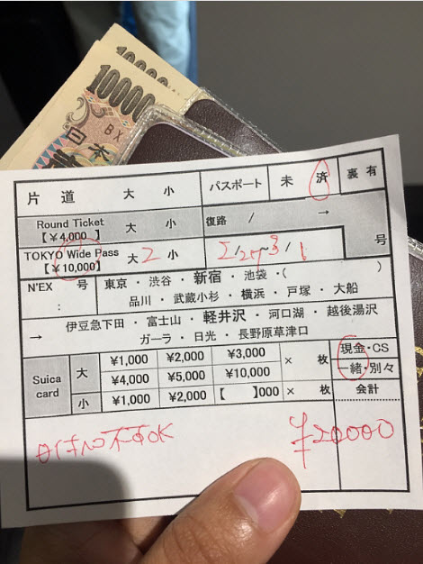 ออกจากตม.มาจุดต่อไปก็รับกระเป๋าและก็เดินออกไปหาซื้อ Tokyo Wide Pass กันค่ะ จุดที่เราจะไปซื้อกันนั้น เมื่อออกมาจากจุดรับกระเป๋าจะเจอบันไดเลื่อนทางซ้ายมือให้ลงบันไดเลื่อนไป แล้วมองหาตัวอักษร JR สีเขียวจะเป็นห้องอยู่ฝั่งซ้ายมือหลังจากลงบันไดเลื่อนไปนะคะ จุดนี้ต่อคิวซื้อค่อนข้างนานค่ะ ถ้าหิวแนะนำให้ซื้อของกินตามร้านสะดวกซื้อรองท้องก่อนเลย และหากเรามีเพลนชัดเจนอยู่แล้วว่าจะไปไหนบ้าง เราสามารถจองที่นั่งและเที่ยวรถไฟได้จากที่นี่เลยค่ะ (เฉพาะสถานที่เที่ยวนอกเมืองโตเกียวนะคะ เดินทางในโตเกียวไม่ต้องจองที่นั่งค่ะ แค่โชว์ Pass ให้เจ้าหน้าที่ดูก็เข้า - ออกได้เลยค่ะ) ราคา Tokyo Wide Pass ราคา 10,000 เยนต่อใบค่ะ