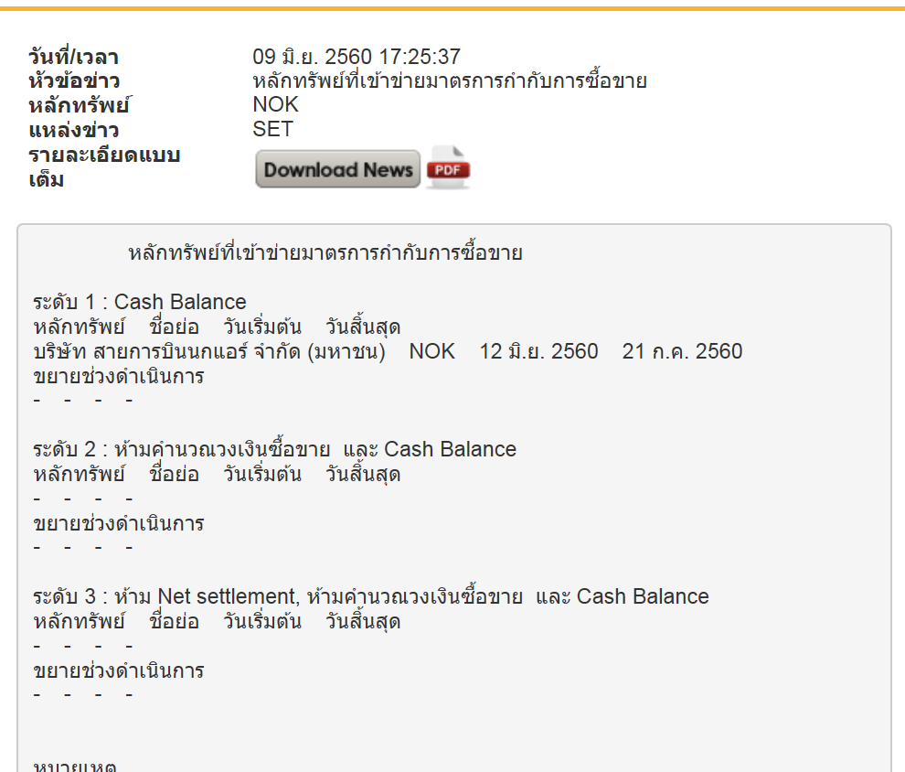 NOK : ตลท ประกาศโดน Cash หกสัปดาห์