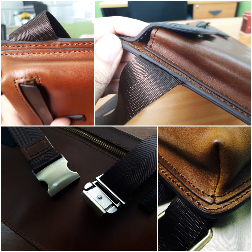 ซึ่งวัสดุที่ใช้ เป็น หนังออยแวกซ์ (Oiled Wax Leather) เป็นหนังที่พอดูรวมๆ แล้วมีเสน่ห์เหลือเกิน ไม่ต้องมาเขินฉันพูดจริงๆ555 รวมถึงทนทาน กันน้ำได้ เพราะมีการเคลือบออยล์ไว้ แต่ก็นะสามารถเกิดรอยได้เมื่อถูกขูดขีด ซึ่งร่องรอยเหล่านี้ไม่เป็นปัญหาถือว่าเป็นเสน่ห์ของกระเป๋าที่เกิดจากผู้ใช้ที่แตกต่างกัน ในส่วนของสายสะพานเป็นผ้าไนล่อน และตัวล็อคเป็นทองเหลือง แต่เอ๊ะคงมีคนสงสัยเหมือนผมว่า ทำไมถึงไม่เป็นสายหนังจะดูไฮกว่านี้ แต่ถ้าเป็นสายหนังจริงๆจะไฮเลย(หมายถึงราคานะ555+)