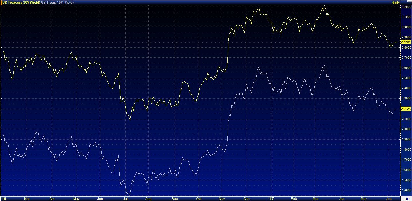 ถ้าไปดูอัตราผลตอบแทนพันธบัตรสหรัฐฯ จุดที่ Yield พุ่งขึ้นไปสูงสุดปีนี้คือช่วงเดือน มี.ค. โดย US Treasury Yield 10yr เคยแตะระดับที่ 2.6258% ส่วน US Treasury Yield 30yr เคยแตะระดับที่ 3.2122% แต่เมื่อคืนนี้ อยู่ที่ 2.20% และ 2.85%