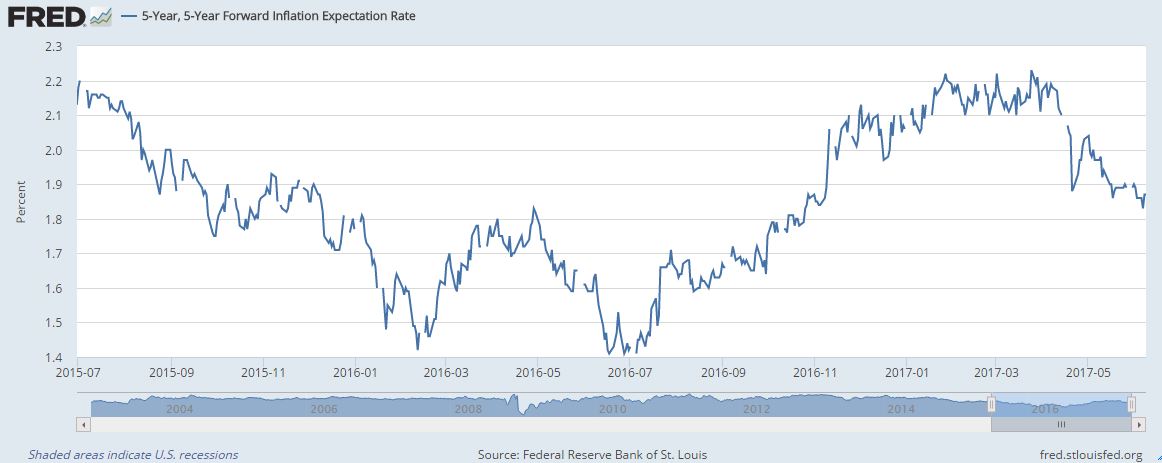 ซึ่งมันก็สะท้อนมาที่ Inflation Expectation โดยดูได้จาก 5-Year Forward Inflation Expectation Rate ของ เฟดสาขา St. Louis ซึ่งล่าสุดอยู่ที่ 1.87% ต่ำกว่า Target ของเฟดที่ตั้งไว้ที่ 2%