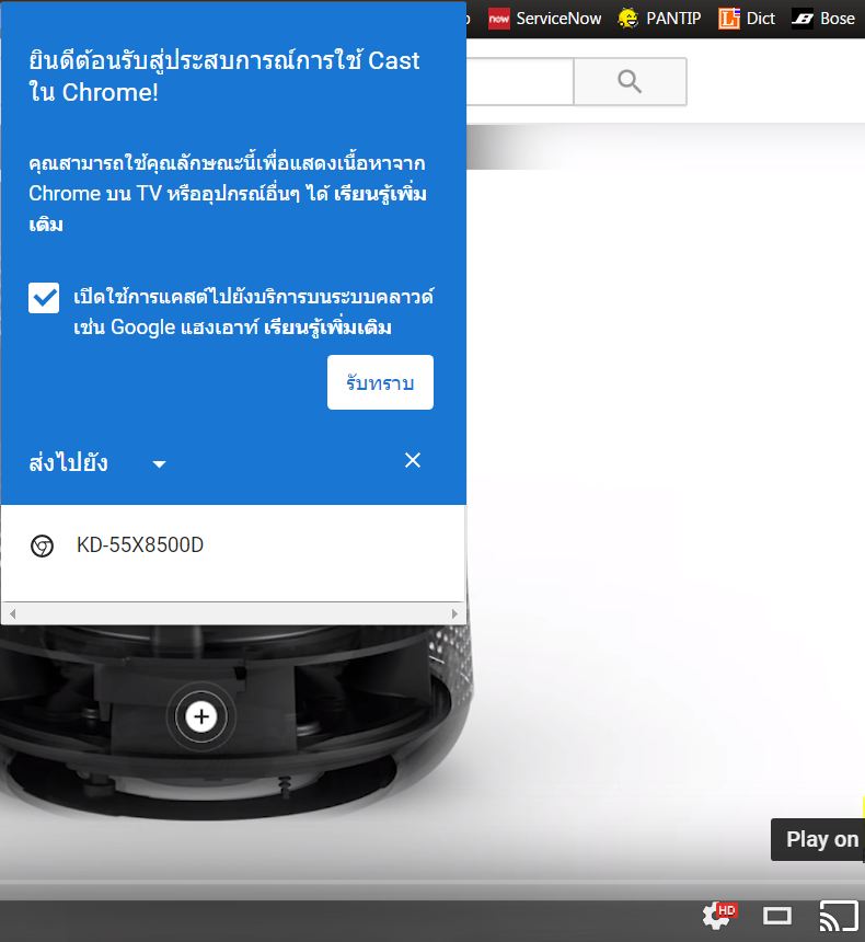 ดู youtube อยู่บนคอมโดยใช้ chrome แล้วสังเกตเห็น อันนี้ครับ cast เข้าไปแล้วเล่นได้ด้วย ทั้งๆที่ผมไม่มีทีวีตัวนี้แล้วก็ไม่มี chromecast ด้วยครับ