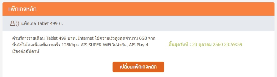 โปรโมชั่นที่เลือกมาตอนไปซื้อเครื่อง ในใบคำขอใช้บริการโทรศัพท์เคลื่อนที่ (มันก็คือใบขอเปิดเบอร์รายเดือน) เขียนไว้ว่า tablet non stop 499 ใน E-SERVICE และ my AIS จะโชว์แบบนี้