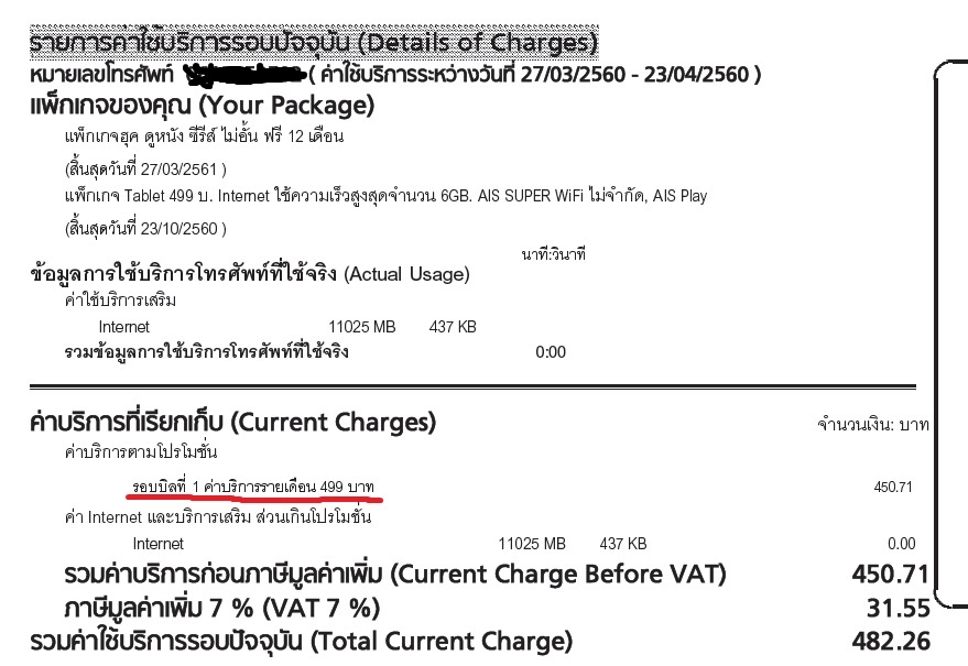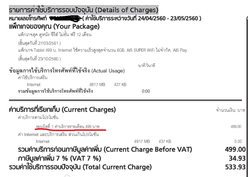 แต่พอเข้ารอบบิลที่สอง SMS ที่แจ้งว่ามียอดค่าใช้บริการเท่าไหร่ก็สร้างความตกใจให้กับจขกท. เล็กๆ เพราะยอดโชว์ต้องจ่ายทั้งหมด 516.19 บาท ซึ่งทำให้คิดว่าระบบทำบิลมันผิดปกติแน่ๆ เลยรอจนใบแจ้งยอดค่าใช้บริการกระดาษมาถึงบ้านแล้วเปิดดูรายละเอียดก็พบว่า "บิลใส่รอบบิลเดือนที่2ผิดพลาดเป็นรอบบิลที่1แทน" ทำให้รอบบิลนี้ไม่ได้รับการหักส่วนลดที่จ่ายไปล่วงหน้า ดังภาพในสปอยนี้ [Spoil] คลิกเพื่อดูข้อความที่ซ่อนไว้ เมื่อเราตรวจสอบคร่าวๆแล้วไม่ได้มาจากความผิดพลาดของเรา เราก็เลยได้สอบถามไปทาง AIS ในเฟซบุ๊กเบื้องต้น ได้ความคืบหน้าดังนี้