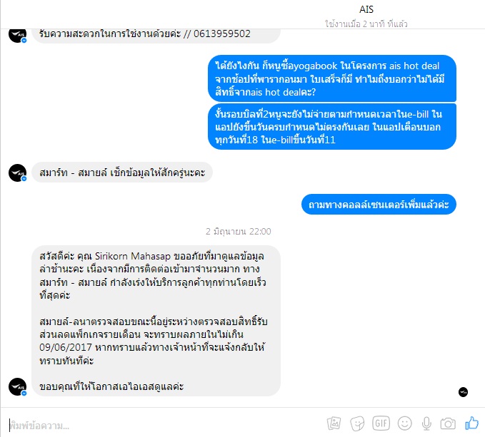 ในภาพที่สองพนักงานยังไม่ได้ตอบอะไรใดๆกลับมา เราก็ไปยืมมือถือคนในบ้านที่เป็นAISมาเพื่อโทรเข้าคอลล์เซนเตอร์ ตั้งใจไปฉะกับพนักงาน ได้ใจความว่าไม่พบส่วนลด HOT DEAL ของเบอร์นี้น๊าาา เดี๋ยวประสานงานให้จ้า ตอนถามเขาเรื่องการจ่ายค่าบริการ เขาก็บอกว่าจ่ายไปเลยไม่หายแน่นอน ถ้าปรับบิลแล้วจะนำไปหักเดือนหน้าๆอีกที (จขกท.ก็แสดงความจำนงไว้ว่าจะไม่จ่ายจนกว่าใบแจ้งค่าใช้บริการจะได้รับการปรับปรุง และมีการหักส่วนลดHOT DEALแล้ว) เพราะกลัวว่าถ้าจ่ายไปแล้ว AISจะทำบิลมั่วแล้วไม่เอาที่จ่ายไปแล้วมาหักลดอีก เข็ดแล้ว !! ซึ่งประจวบเหมาะกับพนักงานตอบกลับมาพอดีว่ากำลังประสานงานให้ จะทราบผลภายในไม่เกินวันที่ 9 มิถุนายน 2560 ตามภาพข้างบน เราก็รอบไปอย่างใจเย็นเพราะรอบบิลมันตัดวันที่ 11 มิถุนายน แต่ในแอป my AIS มันโชว์ว่าตัดวันที่ 18 ของทุกเดือน "จะเชื่ออันไหนได้กันแน่ AISเหมือนกัน แต่โชว์วันตัดรอบบิลไม่เหมือนกัน มันมีความน่าเชื่อถือไหม? ถามหน่อยสิ"