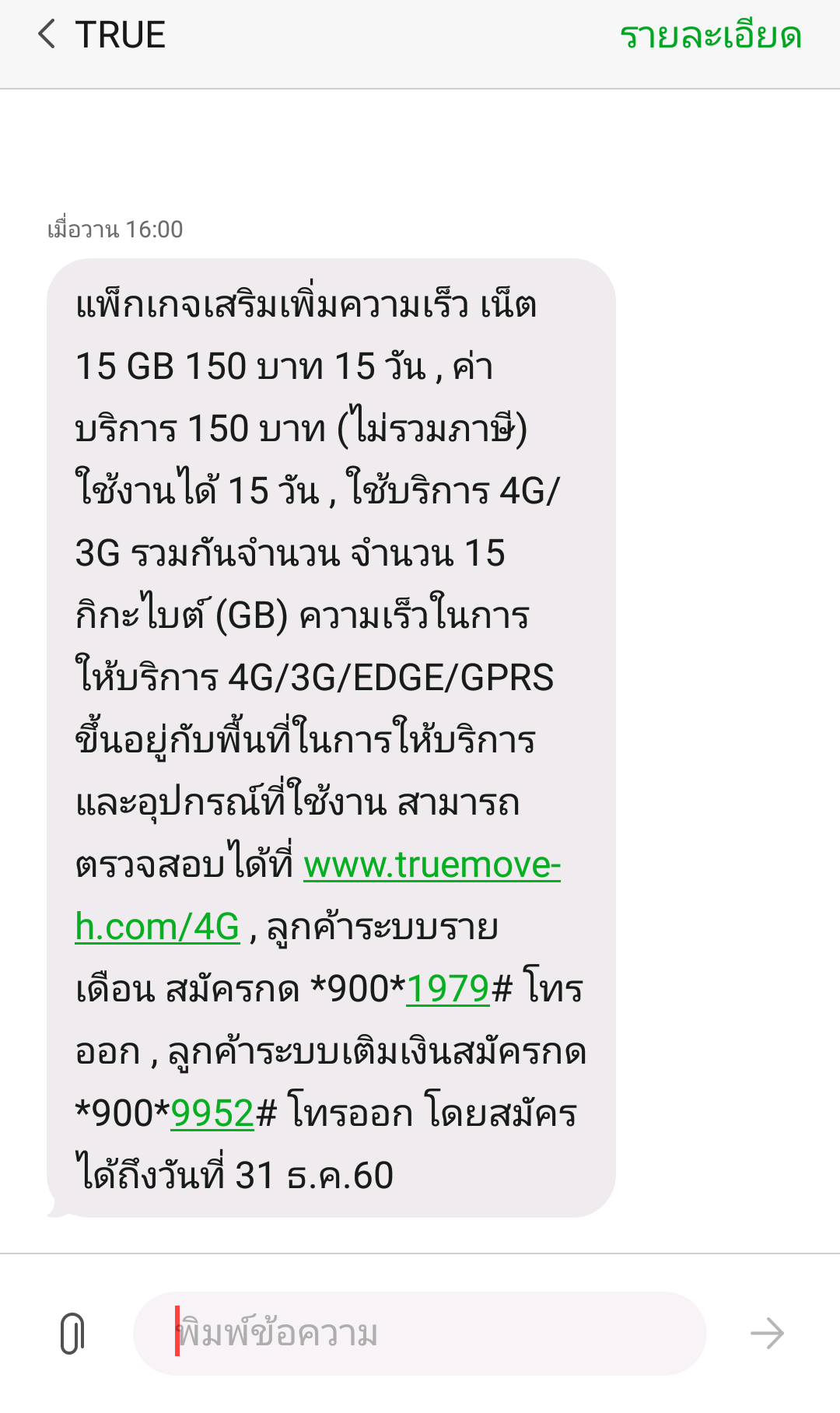 ผมจึงรบกวนให้ทางเจ้าหน้าที่หาโปร net ให้สำหรับเวลา 15 วันที่เหลือ วันต่อมาผมก็ได้รับการติดต่อกลับจาก True เจ้าหน้าที่พร้อมกับแจ้งโปรโมชั่นมาให้ผม