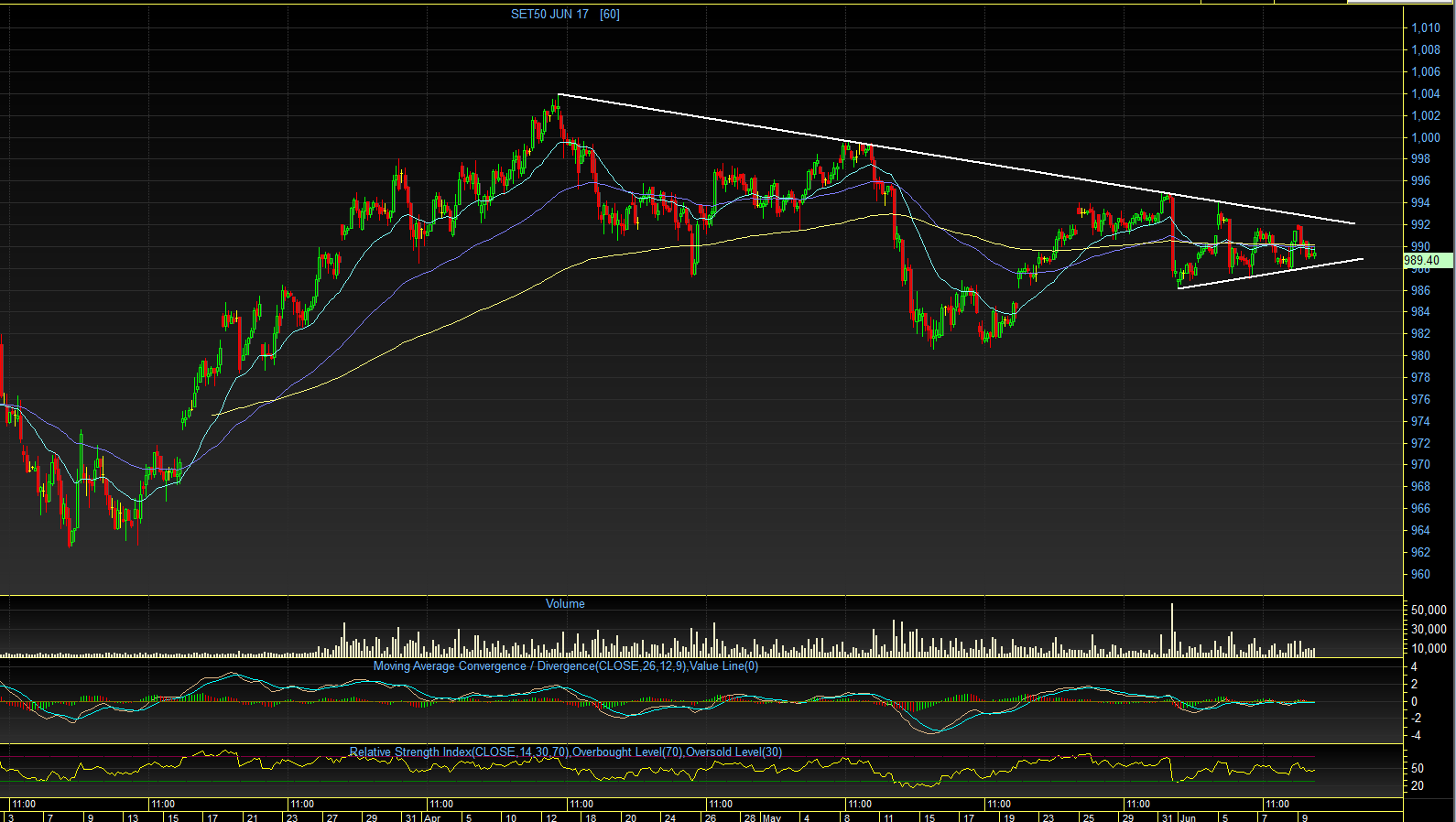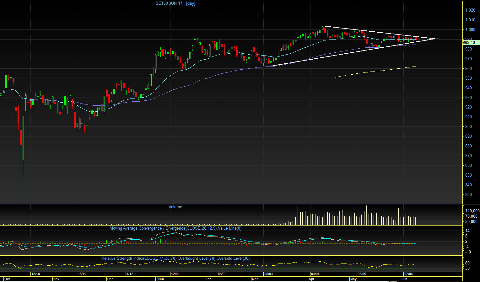 TF60 : นับตั้งแต่ต้นเดือนมิถุนายน จนถึงปัจจุบัน ดัชนียังคงเคลื่อนไหวแกว่งตัว Sideway ในกรอบ (986 - 995 จุด) ซึ่งมีลักษณะรูปแบบ