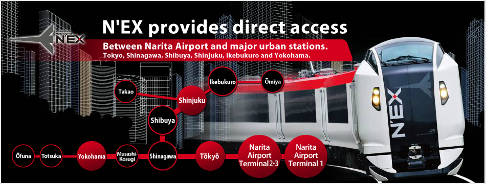 N'EX Narita Express เป็นขบวนรถไฟด่วนที่วิ่งจากสนามบินนาริตะเข้าเมืองครับ จอดหลายสถานี ข้อมูลจากเว็บ official เป็นตามภาพนี้ครับ