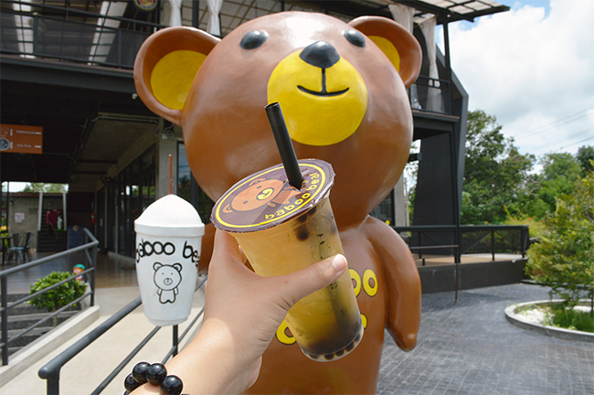 เราเดินทางออกจากบ้านญาติที่จังหวัดปราจีนบุรี เพื่อมุ่งหน้าเข้าสู่ผืนป่าเขาใหญ่ เช้านั้นเรากับพี่ๆ ไม่ได้ทานอะไร เพราะกะว่าจะไปหาอะไรอร่อยๆ ทานระหว่างทาง และก่อนขึ้นเขาใหญ่นั่นเอง คณะเราก็เจอเข้ากับร้าน “Big Mount Bistro & Restaurant” ที่มีพี่หมีตัวใหญ่เวอร์ ! ยืนส่งยิ้มพร้อมแก้วชานมไข่มุกในมือ และด้วยเราที่เป็นทาสชานมไข่มุก.. จึงบังคับให้พี่หันพวงมาลัยเลี้ยวรถเข้าไปทันที