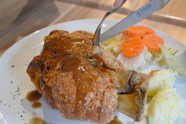 เริ่มจากเมนู Signature อันดับหนึ่ง นั่นก็คือ “ขาหมูเยอรมัน” สนนราคาอยู่ที่ 380 บาท ส่วนตัวเป็นคนชอบทานขาหมูเยอรมันอยู่แล้วค่ะ โดยเฉพาะตรงหนังกรอบๆ ยอมรับว่าบางครั้งก็เฟลกับร้านที่ทอดจนน้ำมันเยิ้มคาหนังนะ แต่ร้านนี้เขาทอดออกมาได้ดีเลยค่ะ หนังกรอบแบบไม่อมน้ำมัน เนื้อข้างในก็สุกกำลังดี เราว่าคนสูงอายุก็สามารถทานเนื้อข้างในได้แบบไม่ปวดฟัน ขาหมูกรอบๆ กินคู่กับผักดองที่ให้มาช่วยตัดเลี่ยนได้แบบพอดี เราให้ 9/10 คะแนนเลย ถ้าจะหักคะแนนก็หักตรงที่พี่เรามันดันเทน้ำราดมันบดลงบนขาหมูนี่แหละ บัดโธ่ !