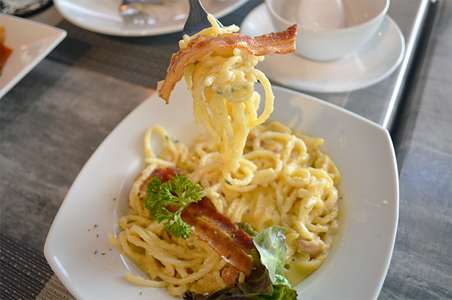 เมนูที่สามเป็น “สปาเก็ตตี้คาโบนาร่า” (อันนี้เป็นความชอบส่วนตัวของพี่สาวล้วนๆ) สนนราคาอยู่ที่ 120 บาท ส่วนตัวเราว่ามันเหมือนสปาเก็ตตี้คาโบนาร่าทั่วไปเลยค่ะ ชอบตรงที่ซอสคาโบนาร่าไม่เลี่ยนชีสจนเกินไป เบคอนที่ทอดก็ไม่อมน้ำมันมากจนเกินไป เราให้คะแนน 8/10 จ้า