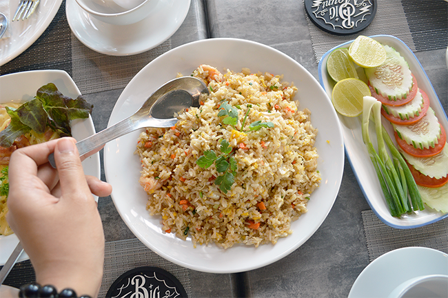 เมื่อซัดชาเขียวมะลิจนหมดแก้ว (ที่สอง) แล้ว เราก็สลับสวิตซ์กระเพาะเข้าสู่โหมดของคาวทันที เนื่องจากตอนเช้าเรายังไม่ได้ทานอะไร ก็เลยตัดสินใจสั่งอาหารมาทาน ซึ่งอาหารที่เป็น Signature ตามที่พนักงานบอกก็คือ “ขาหมูเยอรมัน” และ “Big Mount Zeed” ซึ่งแน่นอนเราก็สั่งตามอย่างว่าง่าย และนอกจากนี้ก็ยังสั่งสปาเก็ตตี้คาโบนาร่า ข้าวผัดกุ้ง พล่าปลาแซลมอน และปีกไก่ทอดน้ำปลา มาตามระดับความหิวค่ะ งั้นต่อมาเราก็ขอรีวิวตามรสชาติที่อยู่ในปากไม่ใช่จากหลักการวิเคราะห์อะไรก็แล้วกันเนอะ ลุย !