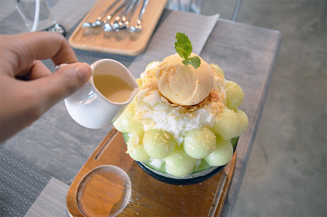 กินคาวเสร็จก็ต้องต่อด้วยของหวานเพื่อล้างปาก ตาม Concept “กินคาวไม่กินหวานสันดารไพร่” อันที่จริงก็กินตามความยากนั้นแหละค่ะ .. อย่าไปอ้างสุภาษิตเลย =_=;; เราสั่งเมนูของหวานขึ้นชื่อ นั่นก็คือ “ปิงซูเมลอน ออน อ้อนนนน” ราคาอยู่ที่ 199 บาทต่อถ้วย ที่นี่เขาเสิร์ฟมาพร้อมกับเปลือกเมลอนที่ขูดให้เราเลยค่ะ เนื้อเมลอนเยอะมากกก เยอะจนไม่รู้จะเริ่มกินยังไงไม่ให้มันเลอะ .. ด้านบนเป็นไอศกรีมวานิลาลูกใหญ่แต่งด้วยใบโหระพา มีนมข้นเพื่อให้เราเอาไว้ราดเพิ่มความหวานค่ะ สรุปเป็นเมนูของหวานที่ไม่ผิดหวังค่ะ เชื่อว่าสาวๆ หลายๆ คนคงชอบและไม่พลาดที่จะสั่งเมนูนี้ เราให้คะแนน 9/10 เลยยย