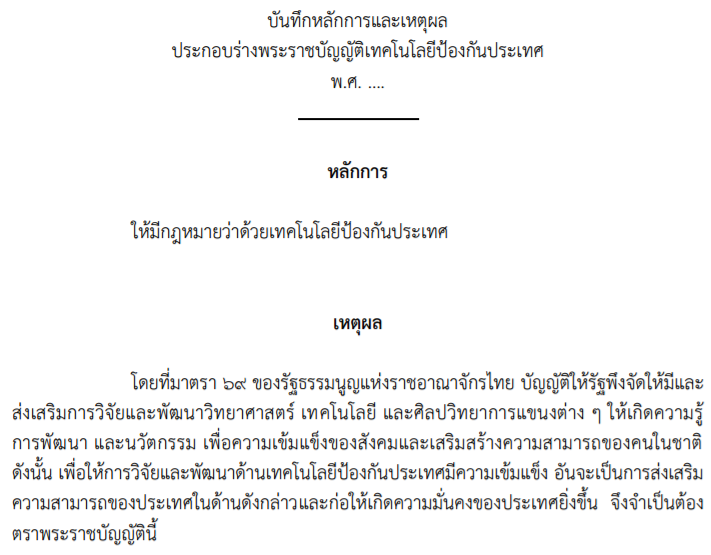 สาระสำคัญของร่างพระราชบัญญัติเทคโนโลยีป้องกันประเทศ พ.ศ. ... นั้นคือการเปลี่ยนจากสถาบันเทคโนโลยีป้องกันประเทศ (องค์การมหาชน) หรือ Defence Technology Institute (Public Organization) ไปเป็นสำนักงานเทคโนโลยีป้องกันประเทศ หรือ Defence Technology Acengy หรือตัวย่อคือ DTA ซึ่งเป็นหน่วยงานของรัฐ มีฐานะเป็นนิติบุคคล และไม่เป็นส่วนราชการตามกฎหมายว่าด้วยระเบียบบริหารราชการแผ่นดิน หรือรัฐวิสาหกิจตามกฎหมายว่าด้วยวิธีการงบประมาณหรือกฎหมายอื่น