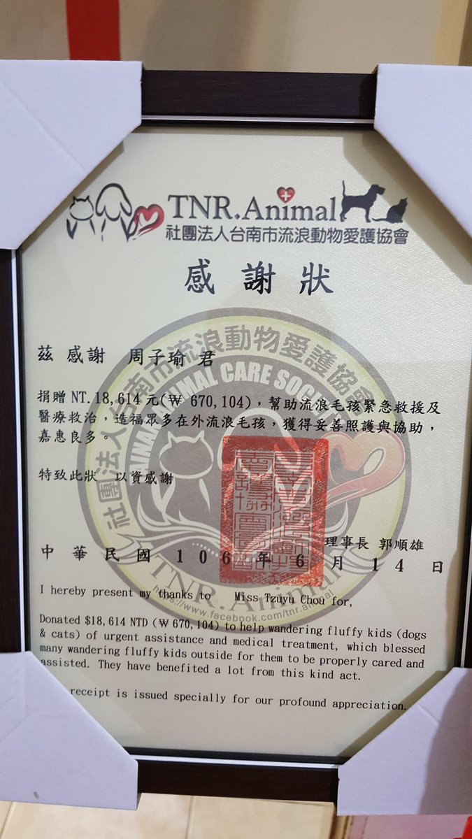 แฟนคลับวันซ์ไต้หวัน ได้ทำการบริจาคเงินจำนวน 18,164 NTD หรือราวๆ 670,104 วอน ให้แก่ ศูนย์ดูแลสัตว์เลื้อยคลาน ในเมืองไถหนาน ประเทศไต้หวัน บ้านเกิดของจื่อวี่