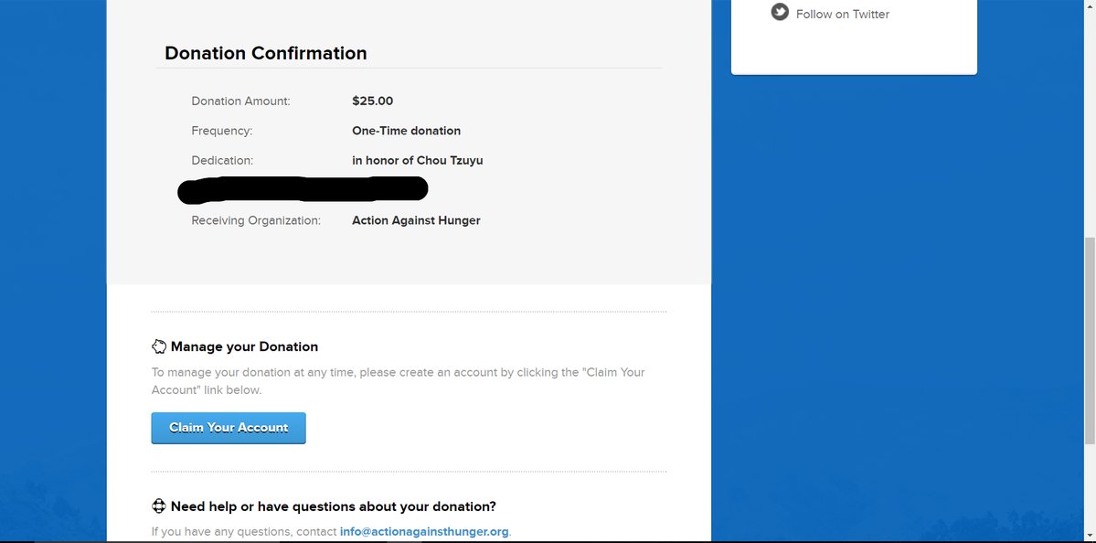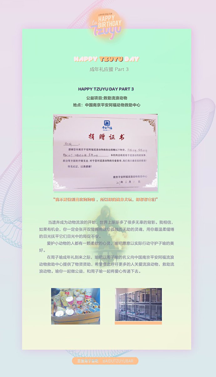 ผู้ใช้ทวิตเตอร์แอคเค้าท์ @dangdangtzu ก็ขอร่วมเป็นส่วนหนึ่งของวันเกิดจื่อวี่ โดยร่วมบริจาค 100เหรียญ แบ่งบริจาคทั้งหมด 4 องค์กร ที่ละ 25 เหรียญ คือ มูลนิธิ ASPCA, WWF, AAH และ BCRF นั่นเอง