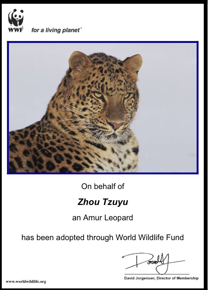 แฟนคลับท่านหนึ่ง ผู้ชื่อแอคเค้าท์ @shineflosh ได้ทำการรับเลี้ยงสัตว์ของมูลนิธิ WWF เพื่อเป็นของขวัญให้จื่อวี่
