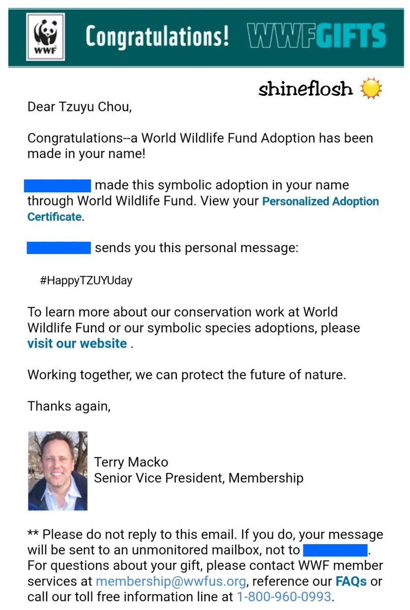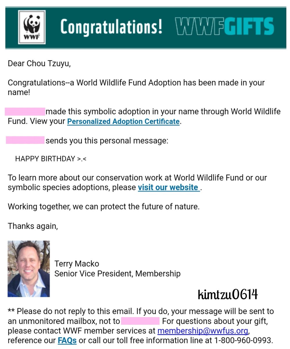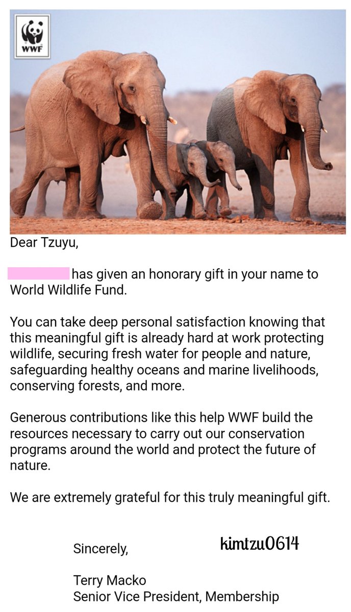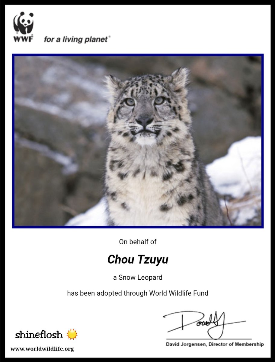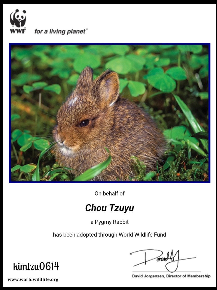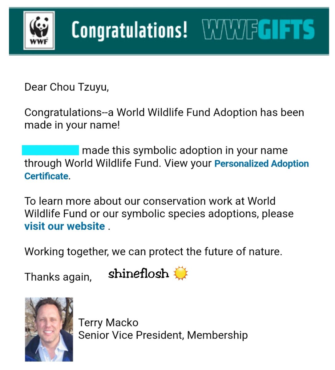 แฟนคลับท่านหนึ่งแอคเค้าท์ @kimtzu0614 ก็ได้ทำการรับเลี้ยงสัตว์จากมูลนิธิ WWF ด้วยเช่นกัน