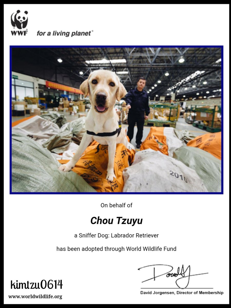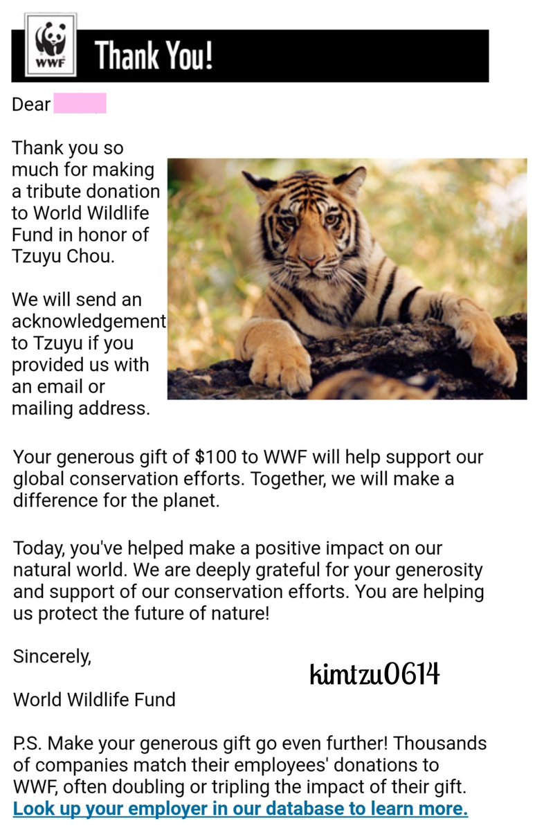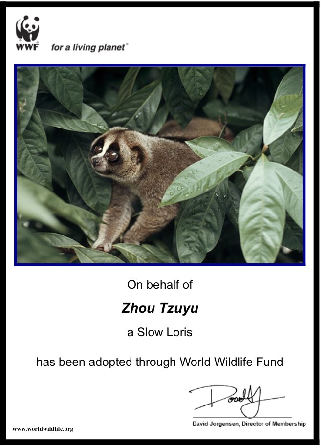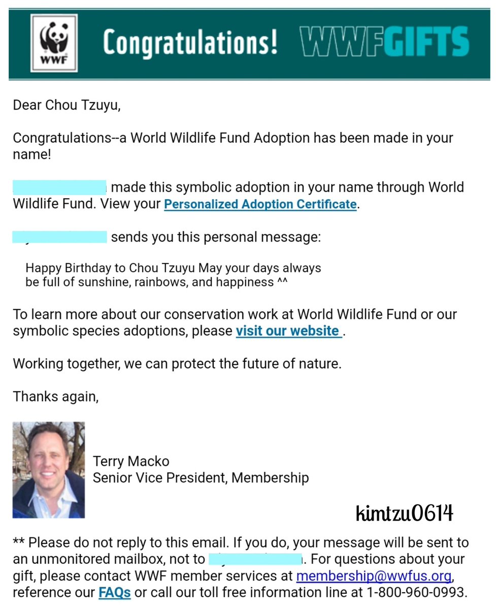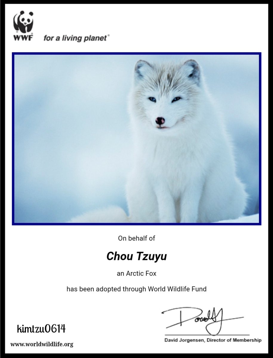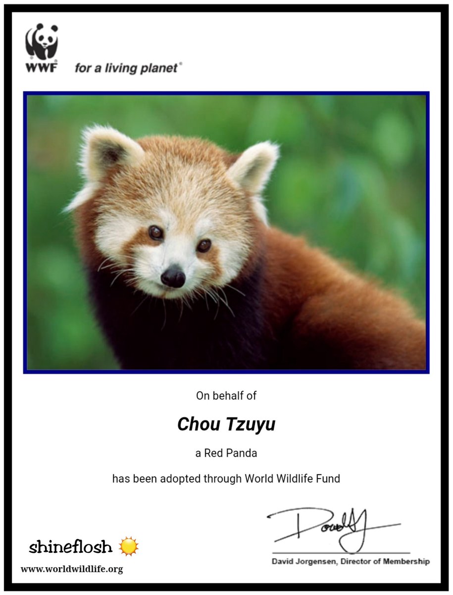 แฟนคลับท่านหนึ่งแอคเค้าท์ @kimtzu0614 ก็ได้ทำการรับเลี้ยงสัตว์จากมูลนิธิ WWF ด้วยเช่นกัน