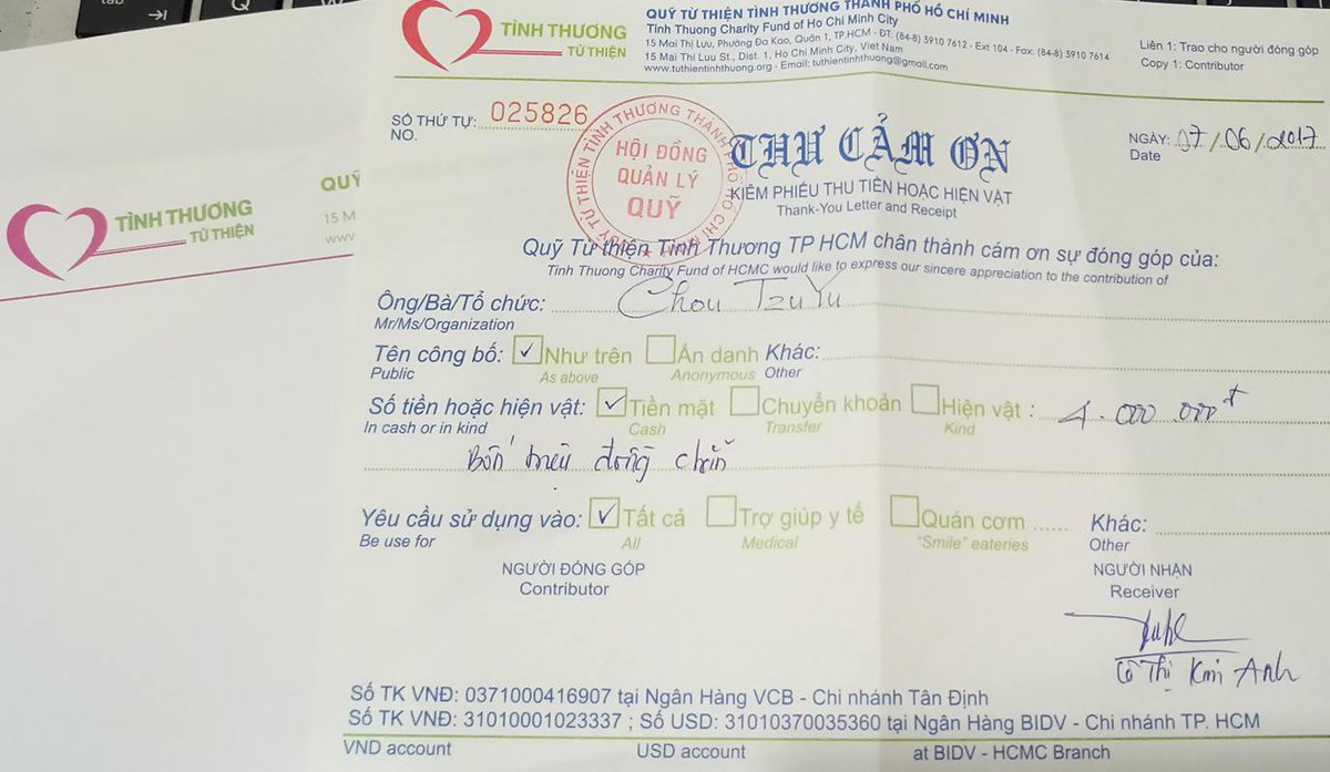 ลงชื่อผู้บริจาคในนาม Chou Tzuyu