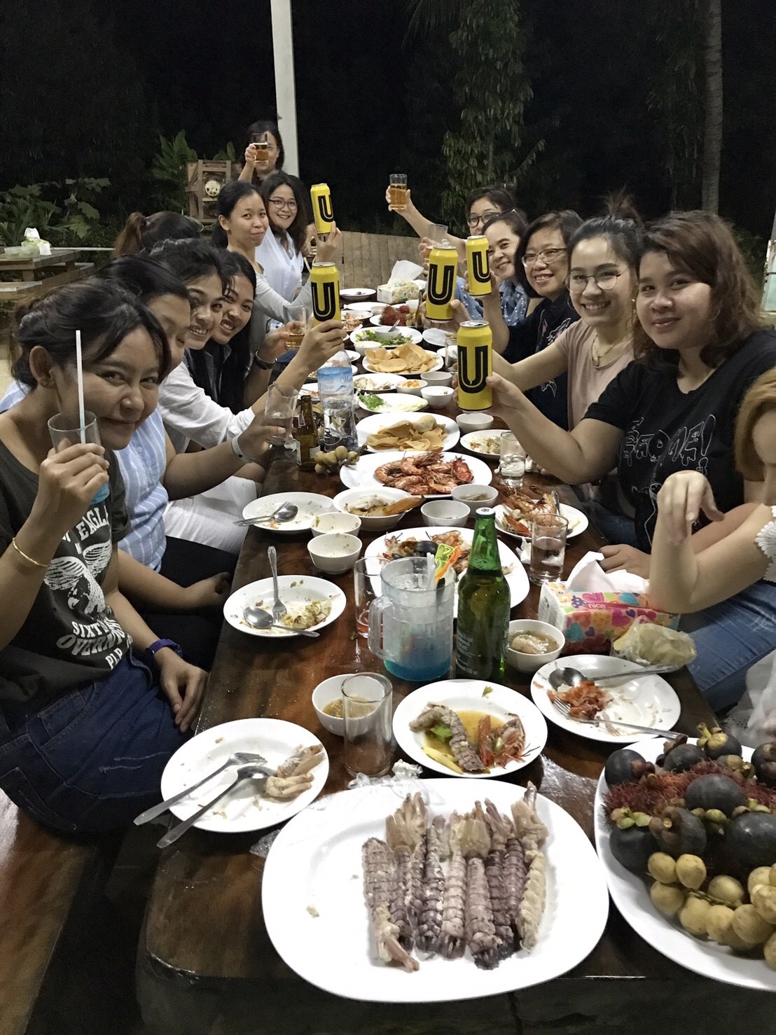 เมื่อวันที่ 10 และ 11 มิถุนายน 2560 ที่ผ่านมา ผมได้พาเพื่อนที่ทำงานรวม 17 คนไปเที่ยวที่จันทบุรี ไม่ได้ไปพักโฮมสเตย์ที่รวมอาหารทะเลเฉลี่ยหัวละ 1,500 บาท เหมือนที่กำลังนิยมกัน เพราะเพื่อน ๆ ต้องการความเป็นส่วนตัวอย่างมาก คือต้องการปลดปล่อยความเครียดจากการทำงานอย่างจริงจัง สำรวจมาหลายที่ จนมาเจอสวนชากใหญ่โฮมสเตย์ ที่พลิ้ว แหลมสิงห์ จันทบุรี เหมาะมากกับจำนวนของคณะเรา สวนชากใหญ่เป็นรีสอร์ทเล็ก ๆ จำนวน 5 หลัง ค่าห้องคืนละ 800 บาท พักได้สองคน มีที่นอนเพิ่มเป็น 3 คนได้โดยทางรีสอร์ทไม่คิดค่าใช้จ่ายเพิ่มเติมอย่างใด สรุปว่า 5 หลังนอนได้ 15 คนก็ยังเกิน เจ้าของรีสอร์ท ยกห้องพักส่วนตัวให้อีกหนึ่งห้องเพื่อจะได้ครบทีมรวมเป็น 6 ห้องครับ หน้าตาที่พักก็ตามนี้