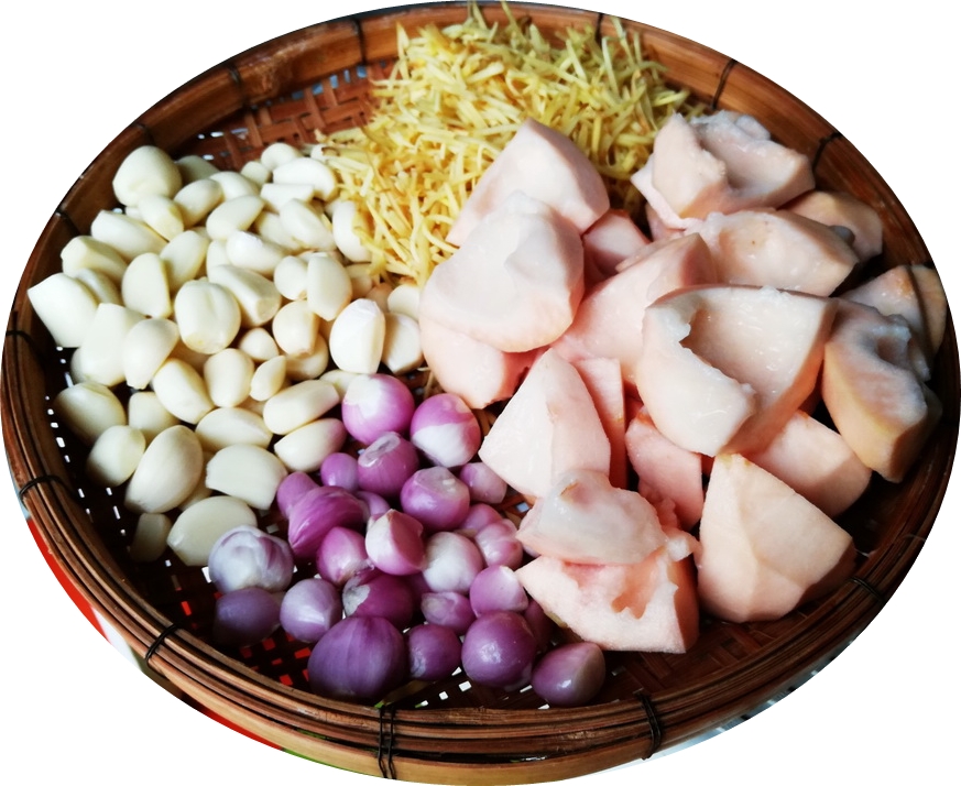 ปอกกระทียม หอมแดง ซอยขิง และกระท้อน ไว้รอใส่กะทะทองเหลือง