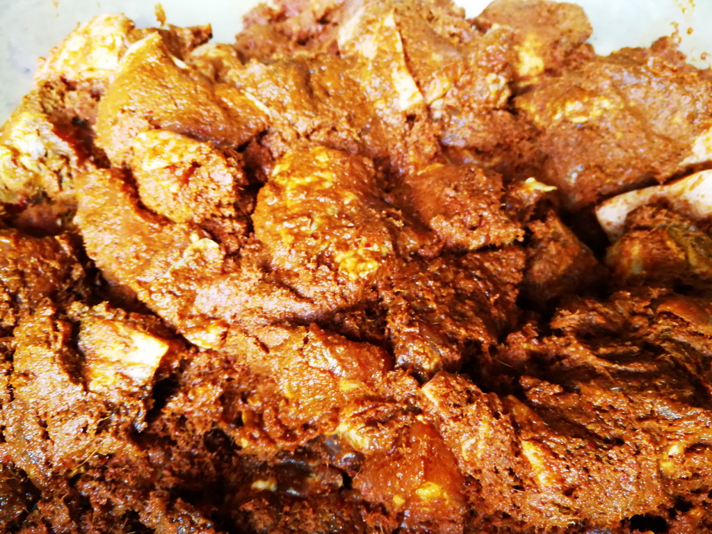 นำเอาเนื้อหมูที่ล้างสะอาด ผึ่งแห้ง แล้วนำไปหมักกับเครื่องแกง ผงฮินเล คลุกเคล้า นวดเบา ๆ ให้พอเข้ากัน แล้วก็หมักเอาไว้ในตู้เย็นประมาณสัก 2 ชม.