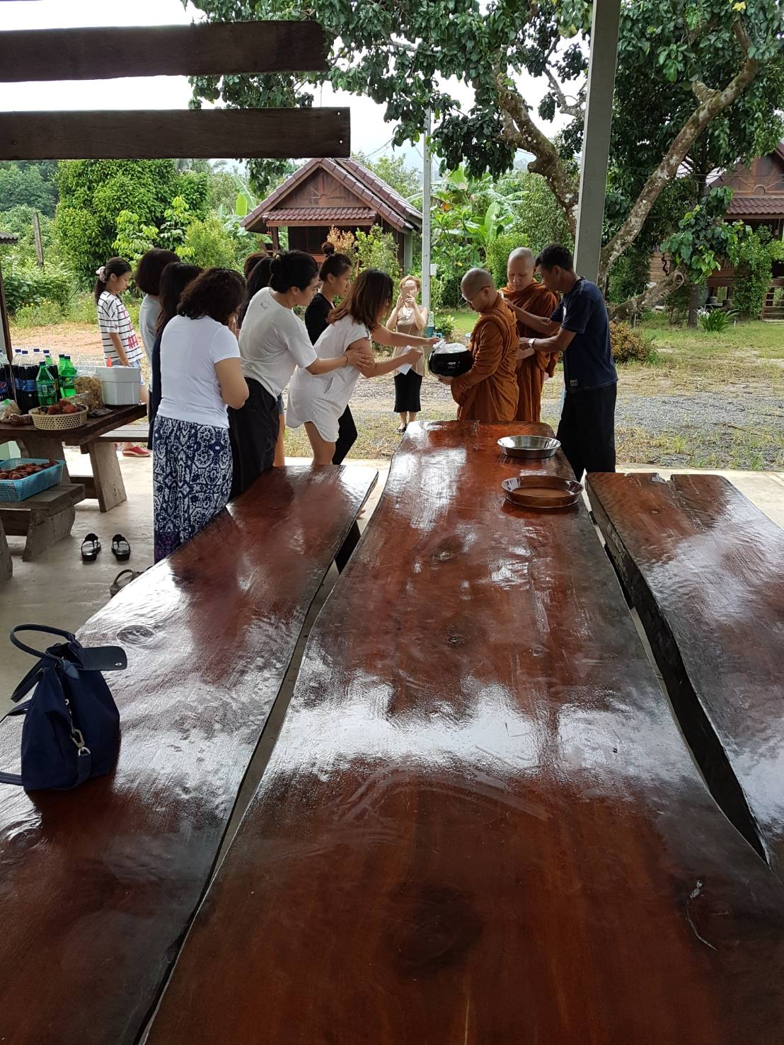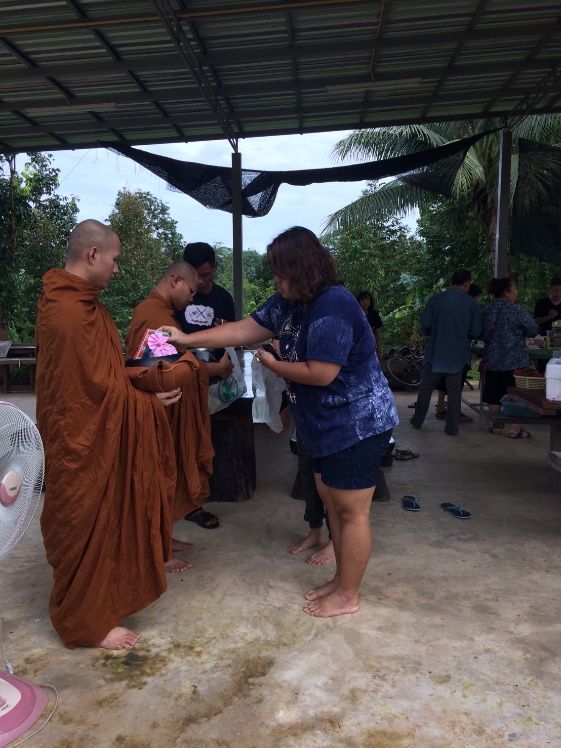 06.00 น. ตื่นมาเจอทีมแม่ครัวพร้อมทำอาหารรอพวกเราแล้ว ล้างหน้าแปรงฟันอาบน้ำอาบท่าแล้วออกมาที่ลาน เพื่อรอใส่บาตรพระก่อน เจ้าของนัดพระวัดชากใหญ่ไว้ให้ 2 องค์เวลา 6.45 น. ปรากฏว่าพระท่านมาก่อน แล้วเป็นเจ้าอาวาสมาเองซะด้วยพร้อมพระลูกวัดอีกหนึ่งองค์ ทีนี้ก็ลนลานกันตื่นสิ