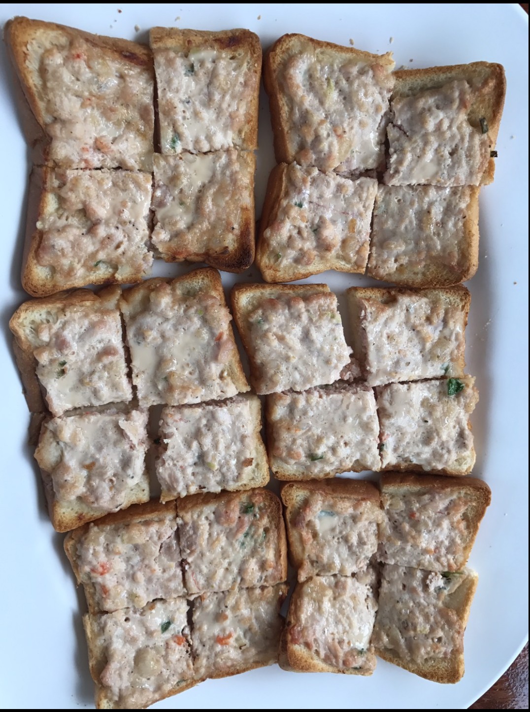 ขนมปังหน้าหมู ใช้ขนมปังตากแดด นำมาใส่หมูแล้วอบ ไม่ใช้ทอดเพราะจะอมน้ำมันไม่น่ากิน อบไปกินไป เอร็ดอร่อย พร้อมอาจาด