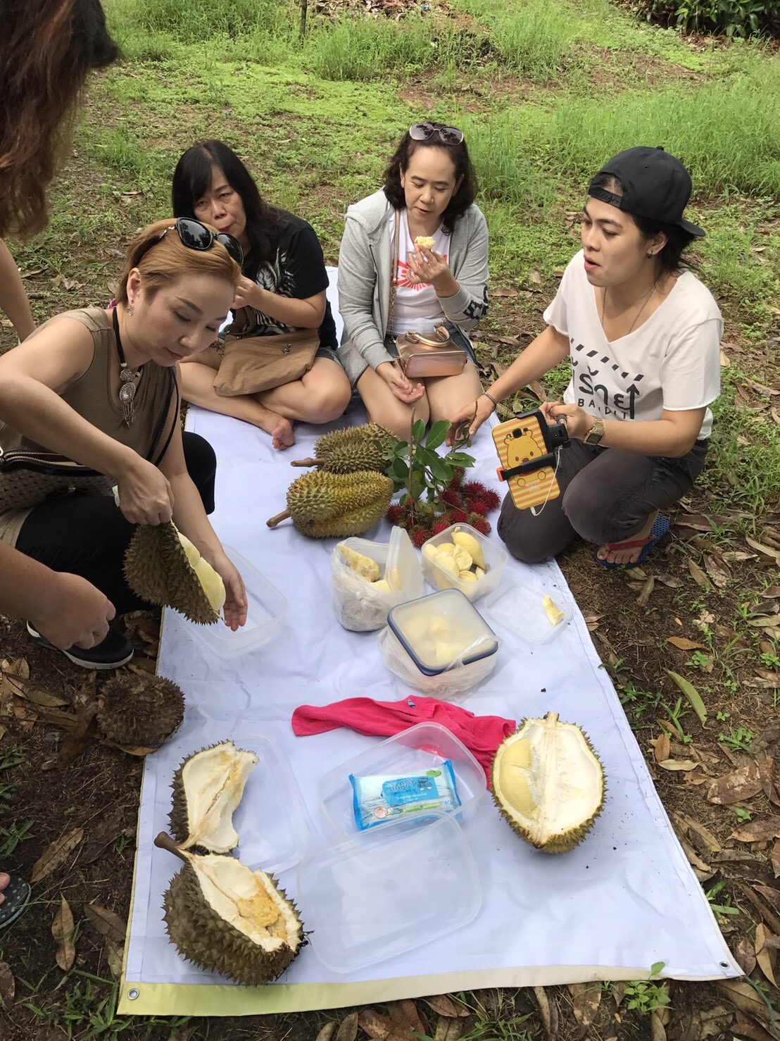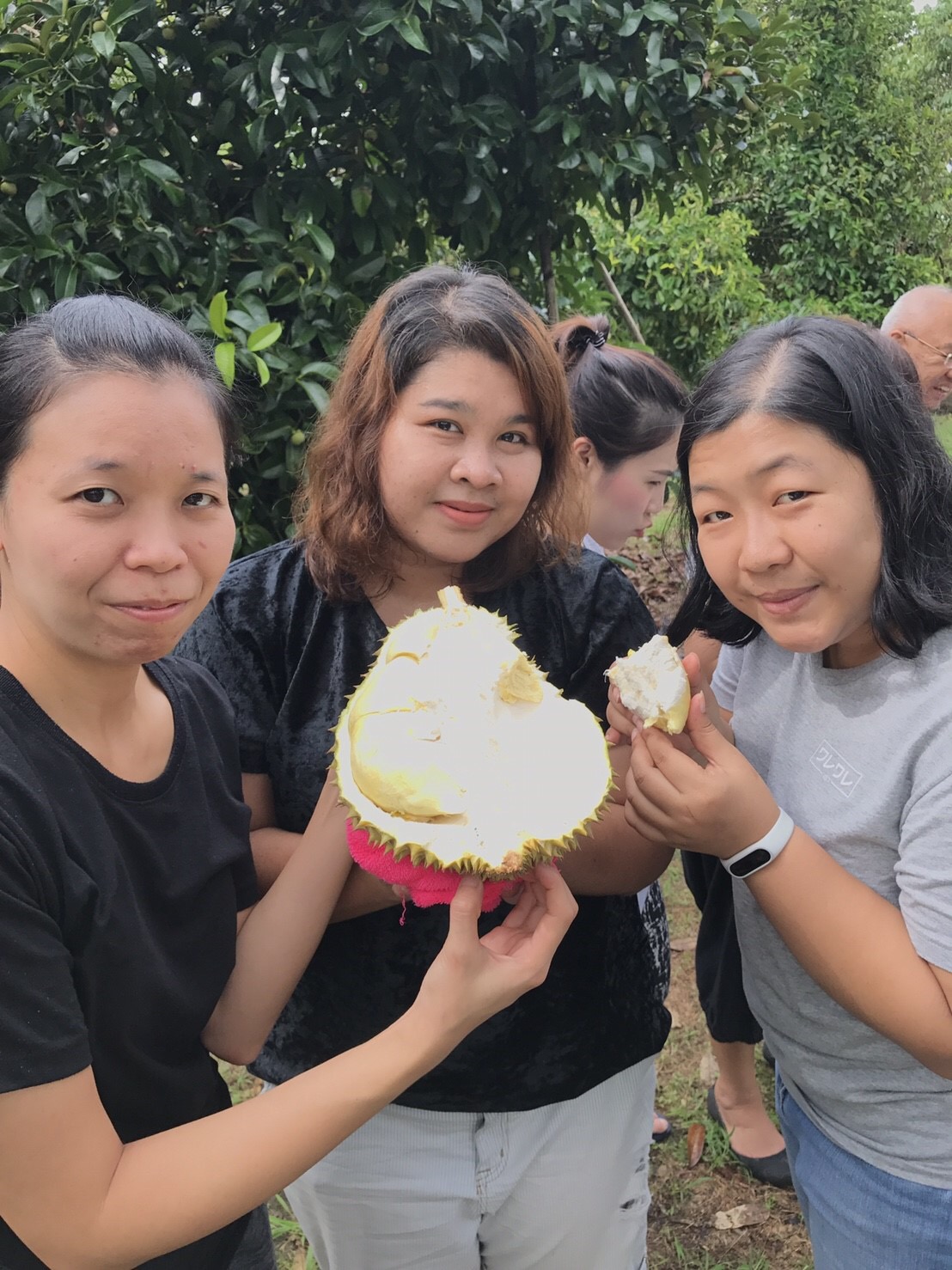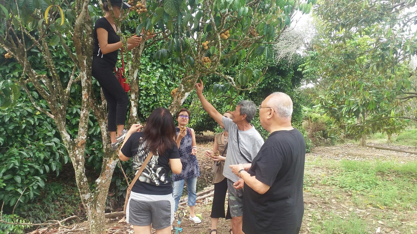 08.30 น. เป้าหมายต่อไปสวนผลไม้ ห่างจากที่พักประมาณ 15 กิโล เด็ด สอย ตัด กินกันในสวน กินกันจนได้ยินเสียงว่าไม่ไหวแล้วนั่นแหละ เจ้าของสวนคือคุณโกวิท ชาวสวน สปอนเซอร์ใหญ่ ไม่คิดเงินสักบาท ถึงได้หยุด ปีนี้เป็นปีทองของชาวสวนอย่างแท้จริง มีล้ง(ผู้รับซื้อส่งออก)เดินมาหาถึงในสวน เพื่อขอตัดส่งออกนอก ได้ราคาดีมากกว่าทุกปี ชาวสวนยิ้มสดใส แต่ผู้บริโภคอย่างเรา ต้องซื้อของแพงกิน ไม่เป็นไรเงินบาทไทยคนไทยได้ เจ้าของสวนใจดี ทั้งให้ฟรี ทั้งแกะให้