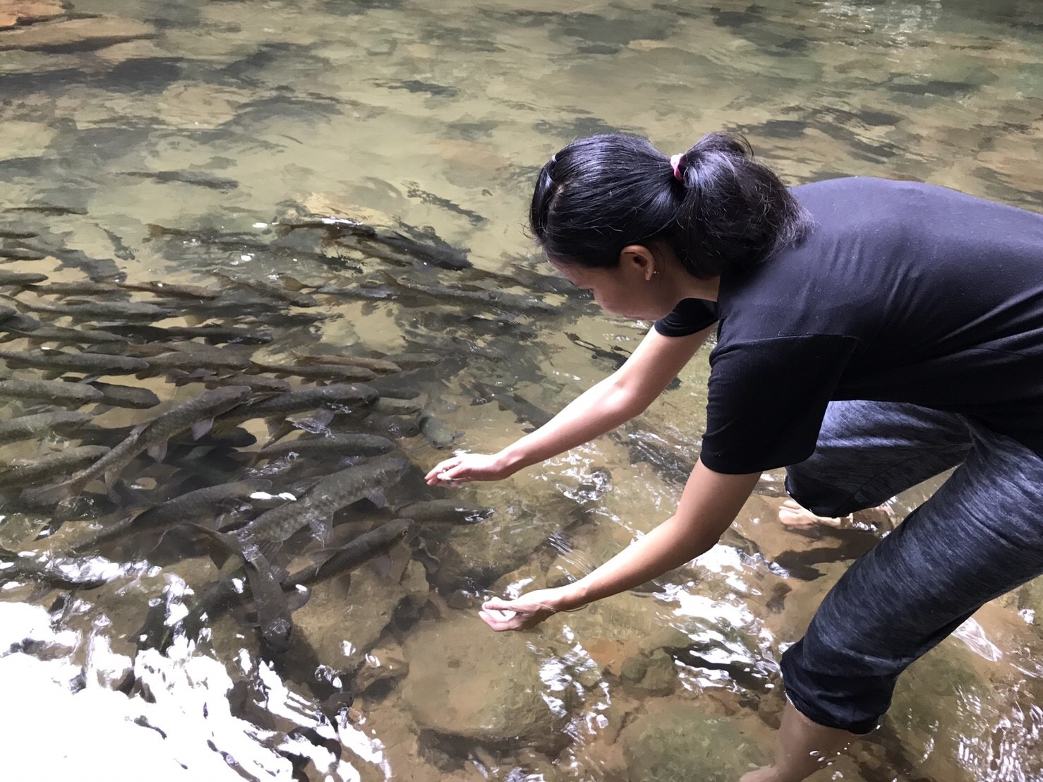 10.30 น. น้ำตกพลิ้ว คือเป้าหมายต่อไป หลังจากเนื้อตัวมอมแมมในสวนแล้ว รถตู้ก็พาเรามาถึงน้ำตกพลิ้ว ซึ่งอยู่ใกล้กับที่พักมาก ห่างไม่เกินสามกิโล น้ำตกพลิ้วปีนี้ไหลแรงมาก เพราะฝนชุ่มน้ำฉ่ำดีเหลือเกิน ปลาพลวงเต็มไปหมด ตัวใหญ่จะมาว่ายวน ๆ ไม่ทำอะไร ส่วนตัวเล็กจะมาตอดที่เท้า