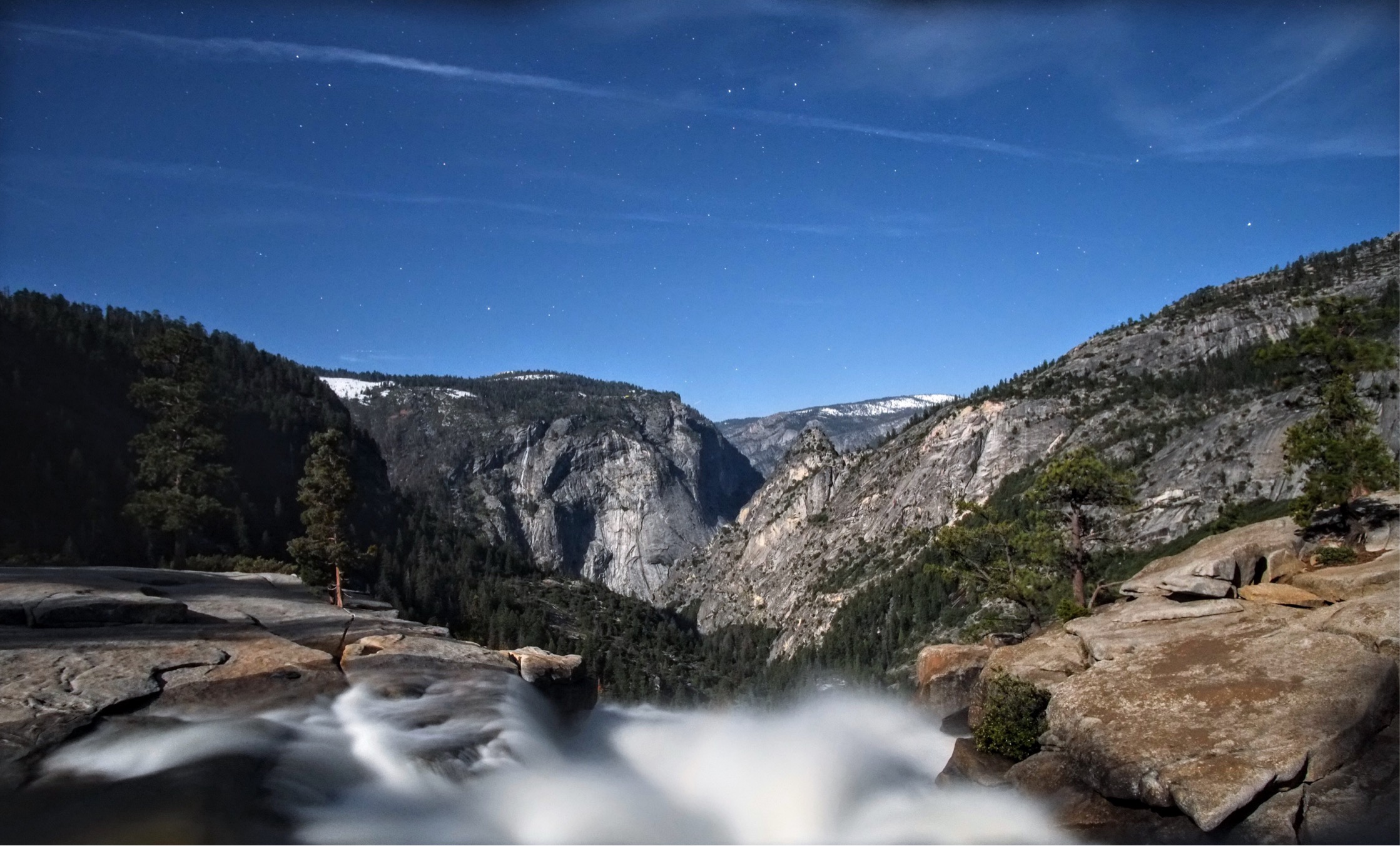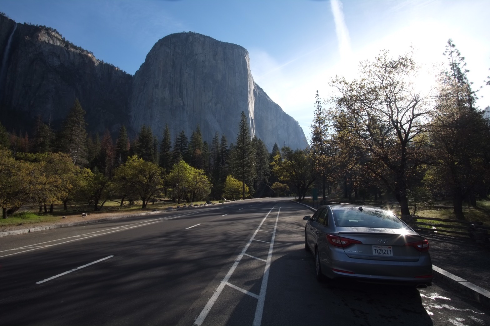 หลังจากเราประทับใจกับความมืดและแสงจันทร์กระทบยอดเขาและน้ำตกกันพอสมควร เราขับรถรอบ Yosemite valley ซึ่งเป็นที่ราบในหมู่หุบเขามากมายและเป็นใจกลางและจุดเริ่มต้นในการผจญภัยใน Yosemite เราหาไหล่ทางใต้ต้นไม้ใหญ่ใกล้หน้าผาสูงชันเป็นที่สำหรับจอดรถพักผ่อนสำหรับคืนนี้ ณ เวลา 00:00 นาฬิกา